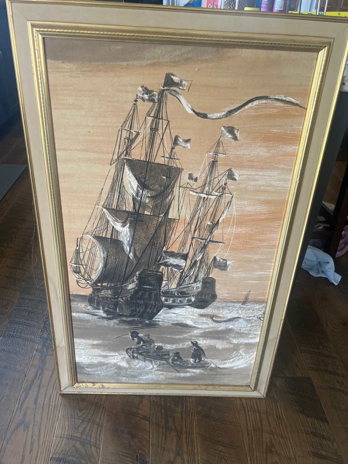This is a large-scale, expressive mixed media work on textured substrate depicting two 17th-century style galleons amidst a churning sea.