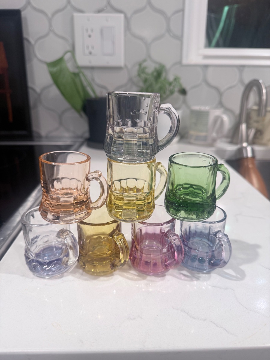 A vibrant set of eight miniature pressed-glass mugs, designed to mimic full-sized beer steins in a whimsical, diminutive form.
