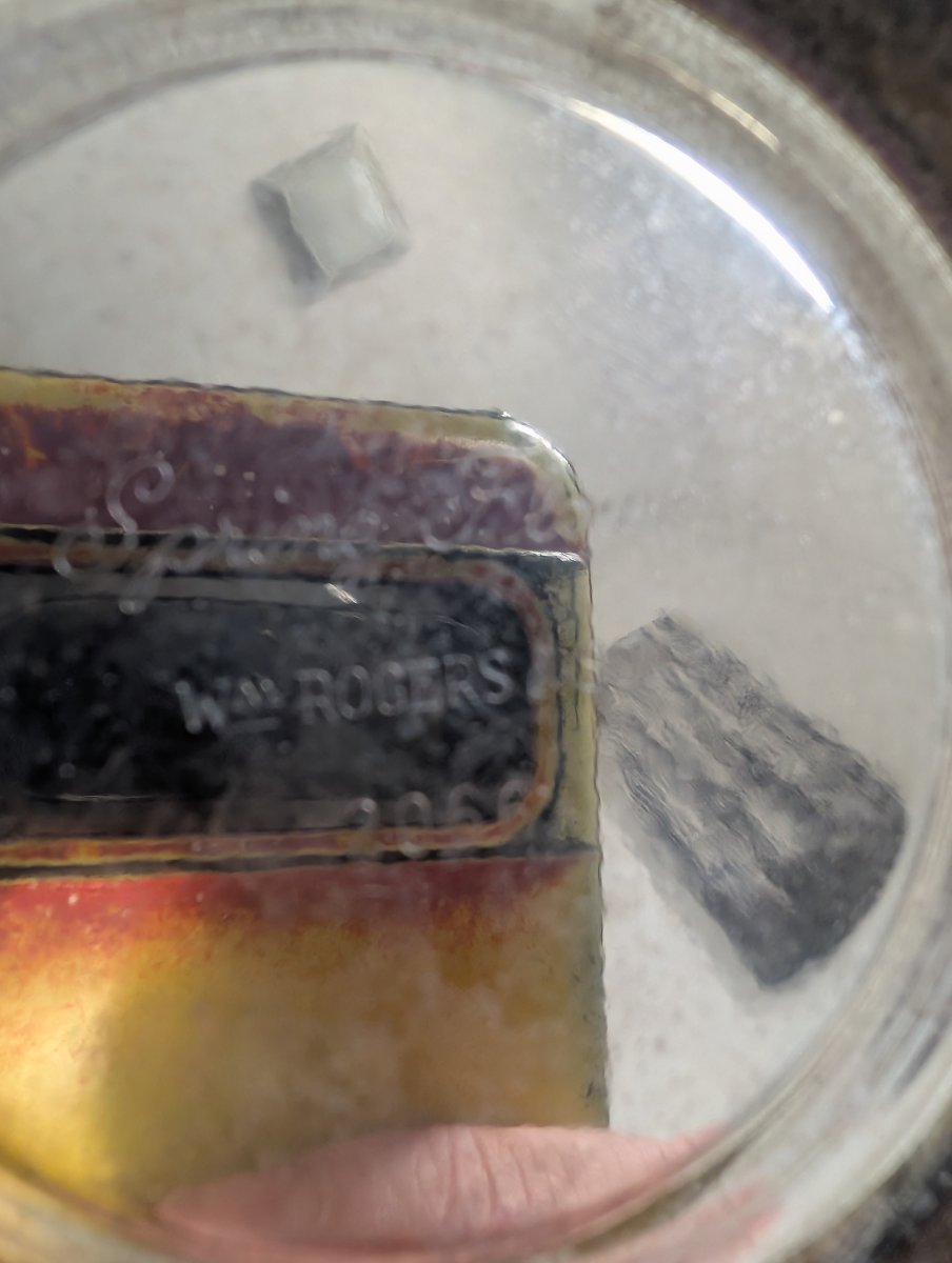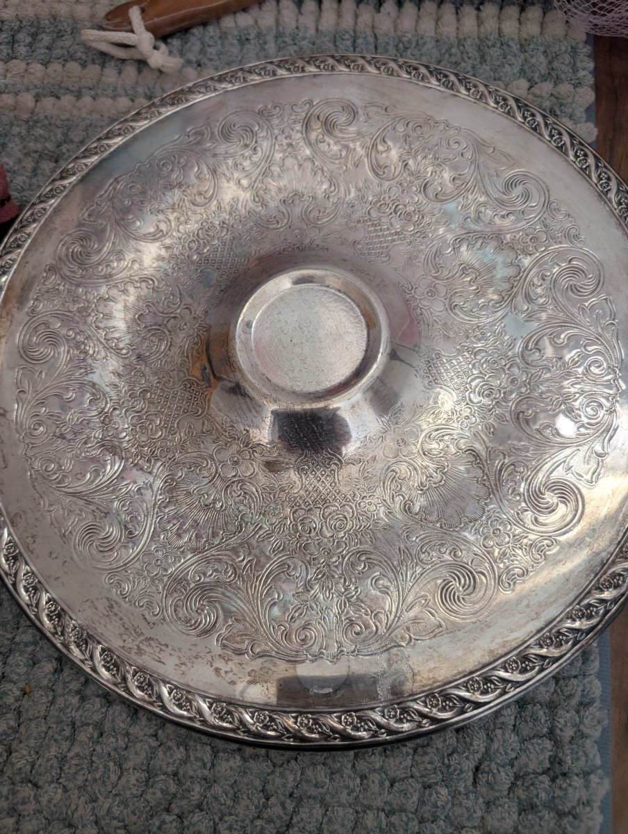 The photos show visible tarnish and surface oxidation, along with some 'bleeding' where the silver plating has worn thin on the raised edges, revealing the darker base… Silverplate values are currently modest as modern lifestyles favor dishwasher-safe items.