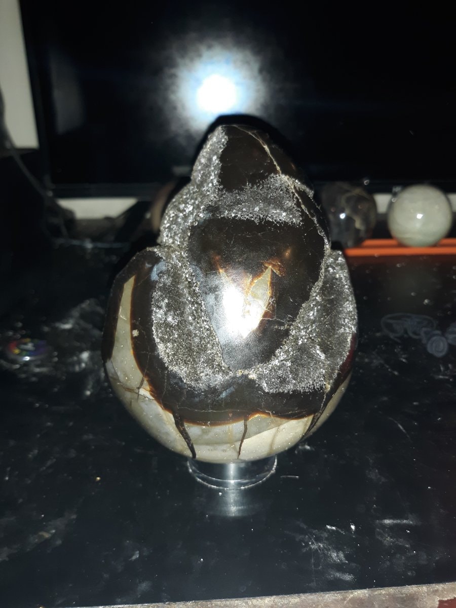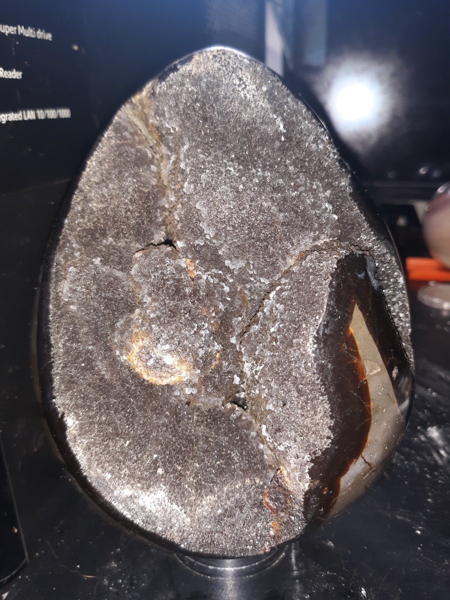This is a septarian nodule, a unique sedimentary geode characterized by its 'dragon skin' exterior pattern of yellow calcite and brown aragonite.