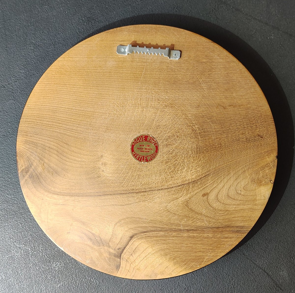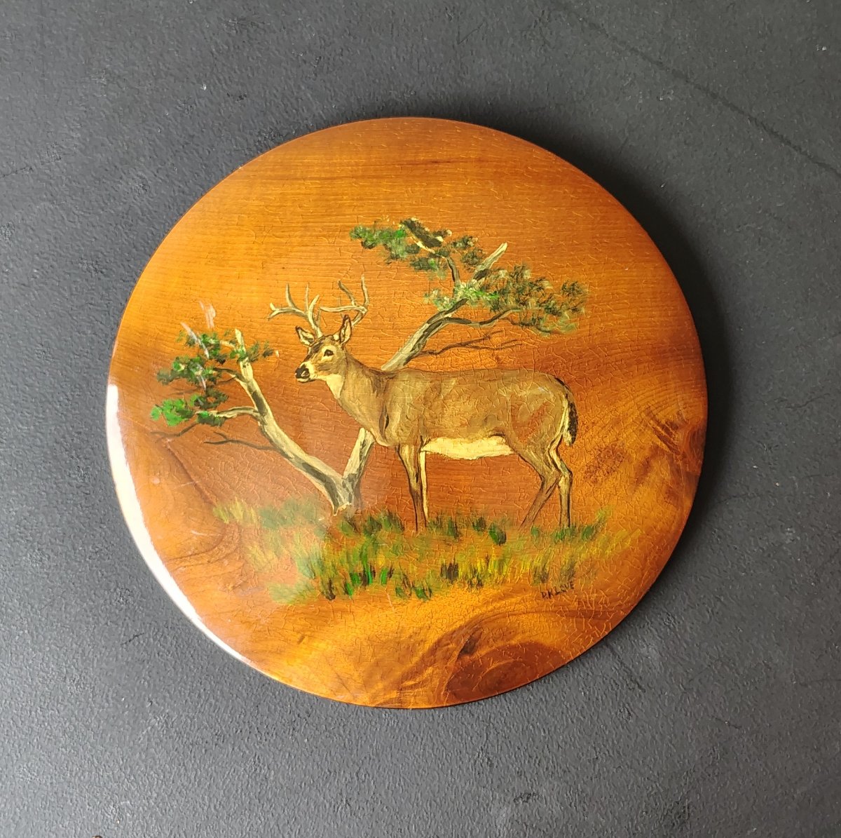A classic piece of Pacific Northwest folk art featuring a hand-painted buck on a polished round of rare Myrtlewood.