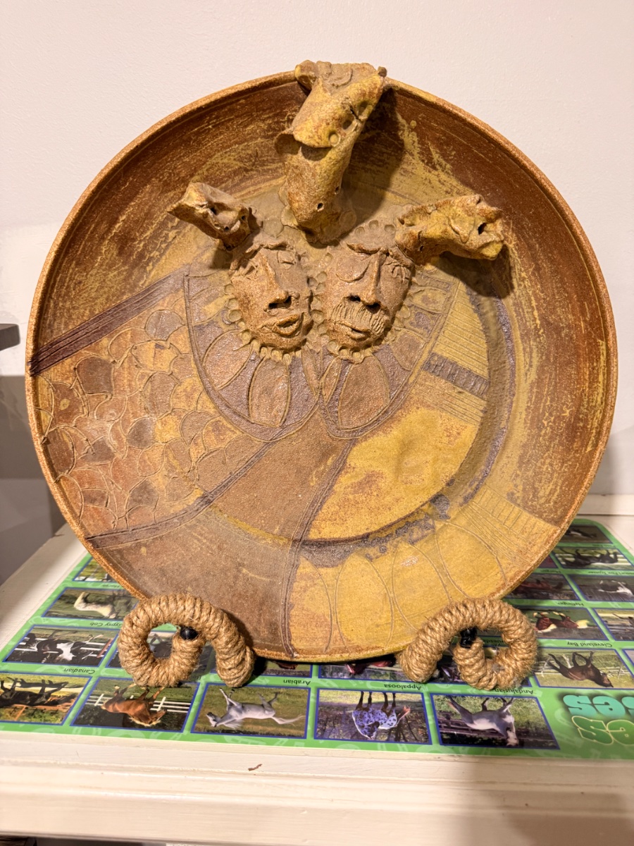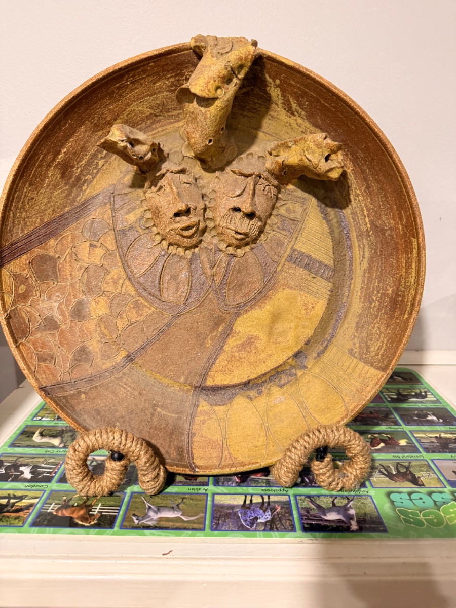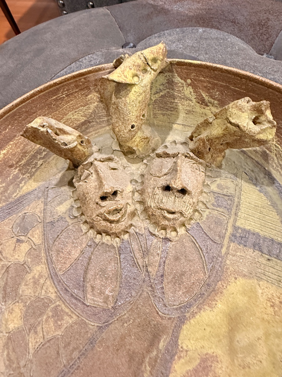 A monumental stoneware charger featuring high-relief sculptural elements, including two stylized faces and three organic, horn-like protrusions.