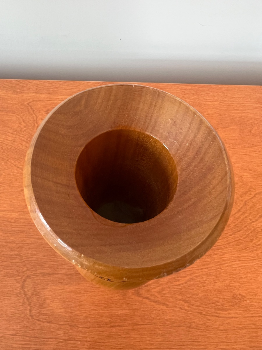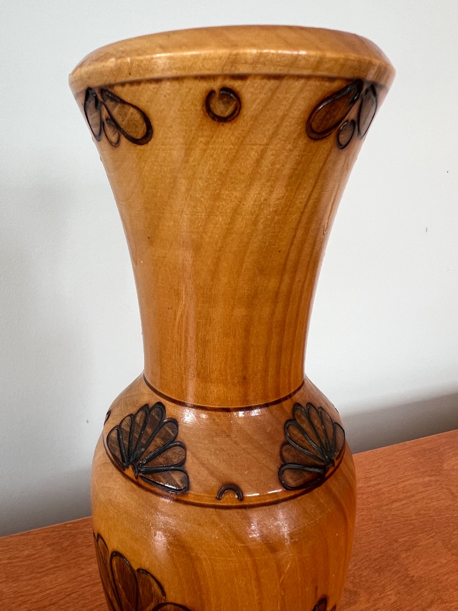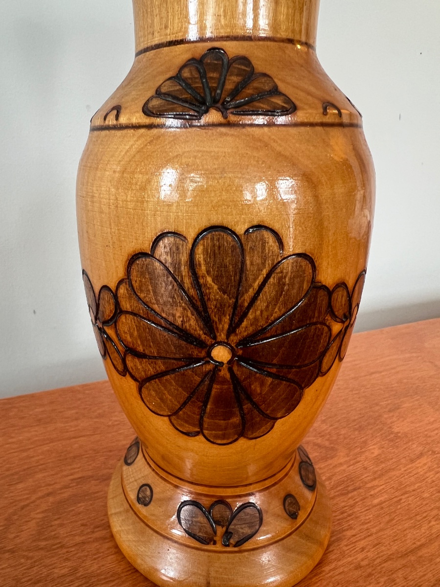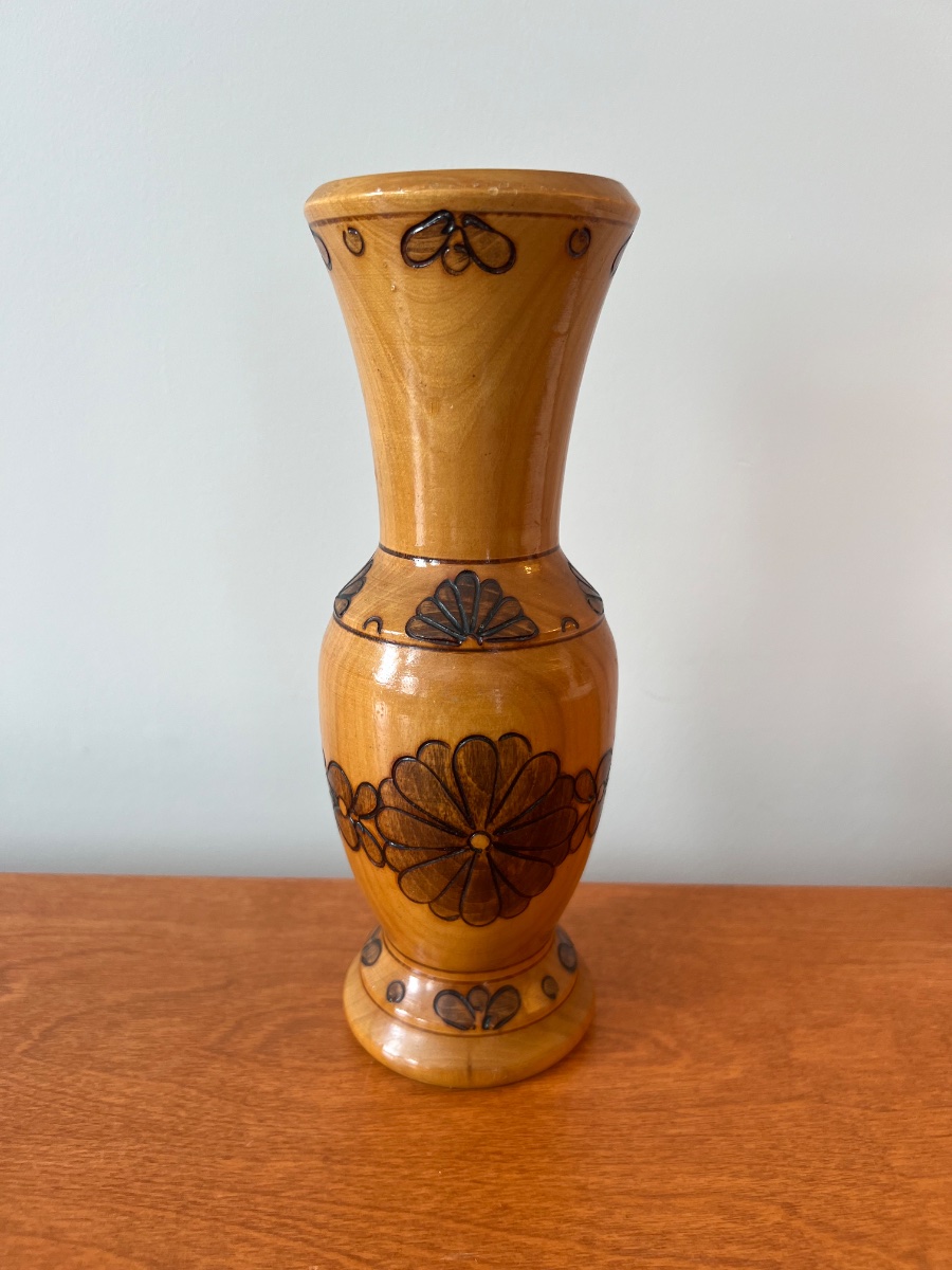 A hand-turned wooden vase featuring scorched floral motifs created through the art of pyrography. The piece is finished with a high-gloss protective lacquer, typical of mid-century decorative souvenir ware.