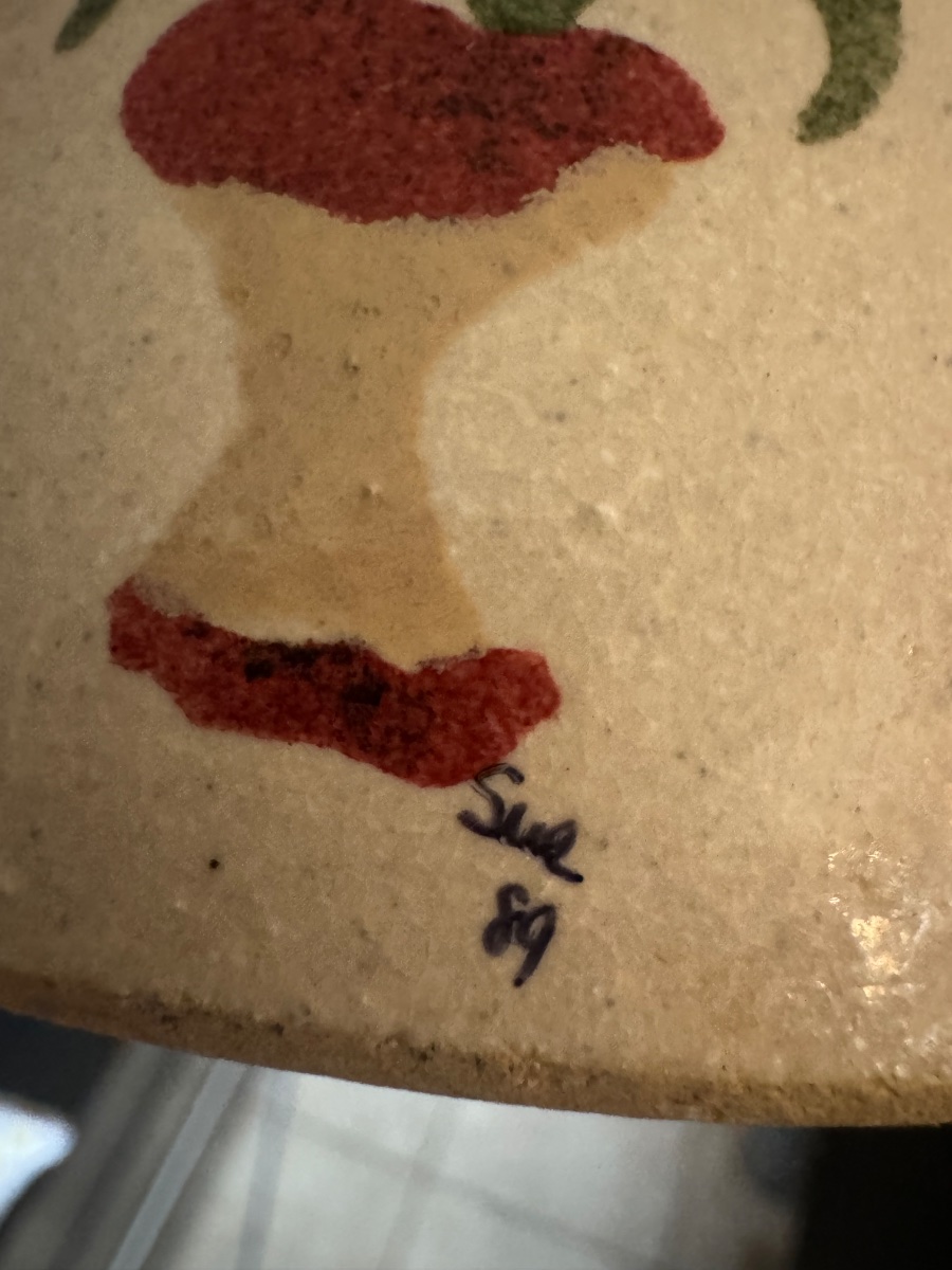 The piece appears to be in excellent vintage condition with the factory stamp and artist's signature both crisp and legible. While Robinson Ransbottom produced many thousands of these jars, the unique hand-painted 'story' and the fact that the company is now defunct adds a premium for…