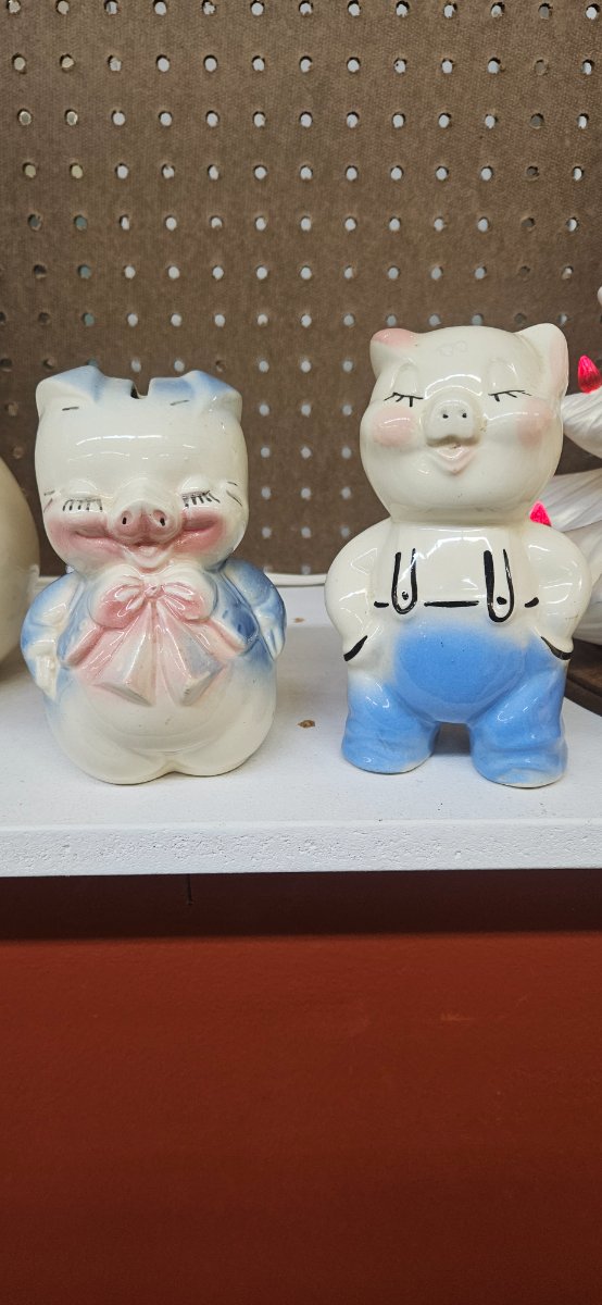 A delightful pair of slip-cast ceramic 'still banks' featuring anthropomorphic pigs with hand-painted details.
