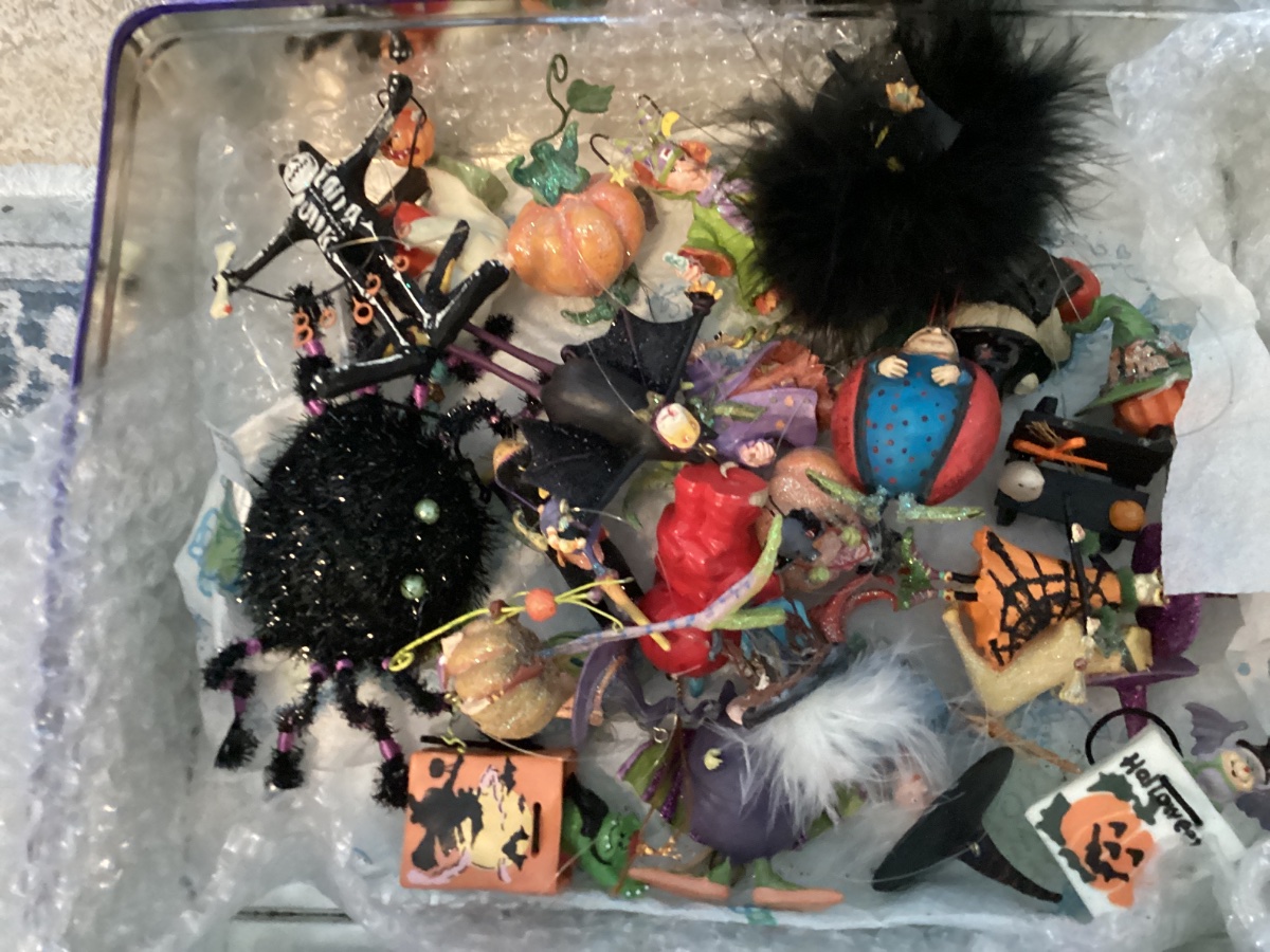 A curated assortment of high-end, mixed-media Halloween ornaments featuring hand-painted resin, feathers, and glitter.