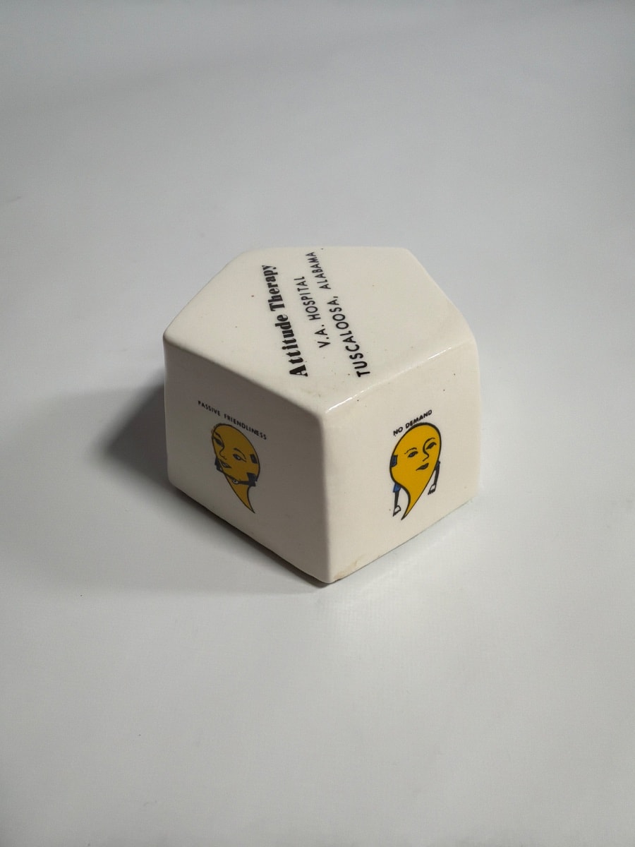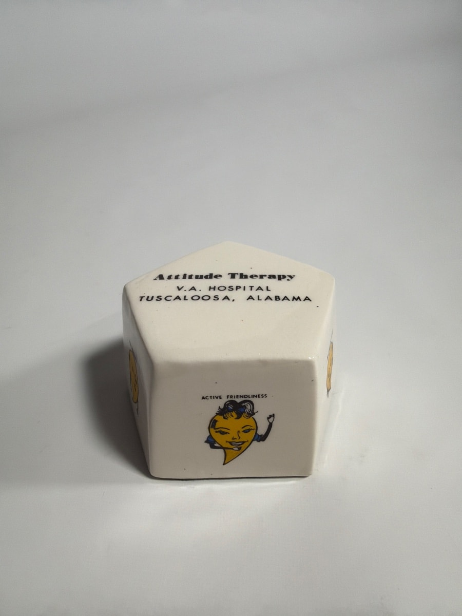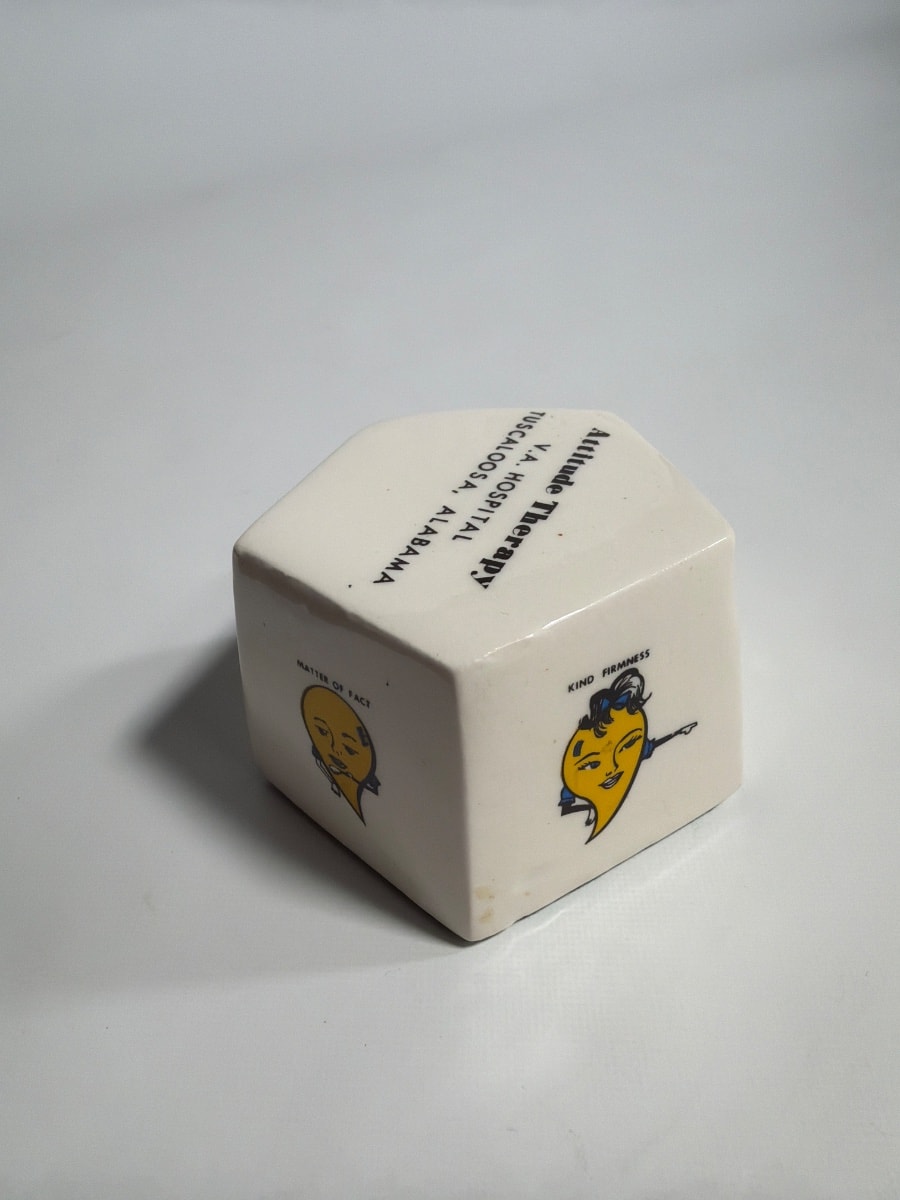A rare pentagonal ceramic desk accessory used as a clinical training aid for psychiatric staff. Each of the five sides features a transfer-print illustration representing a specific behavioral response prescribed to healthcare workers.