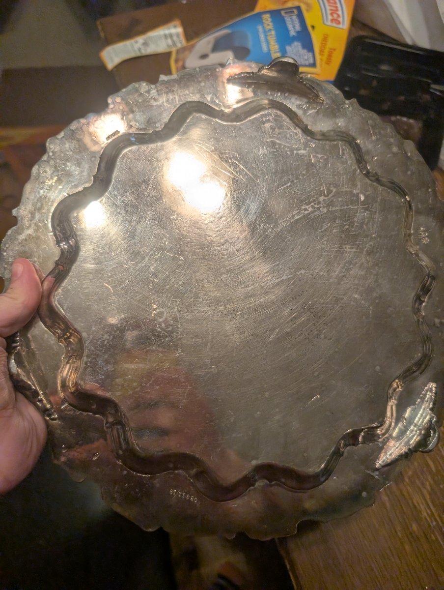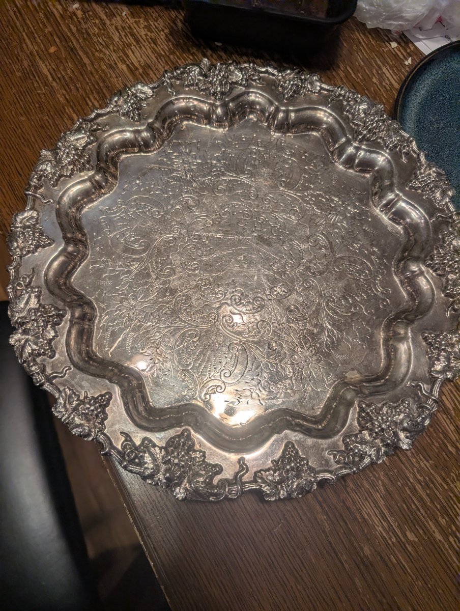 The tray shows significant surface scratching and 'swirls' from years of polishing, which is expected. As a silver-plated piece rather than solid sterling, the value is driven by its decorative appeal and the popularity of the 'Vintage' grape pattern.