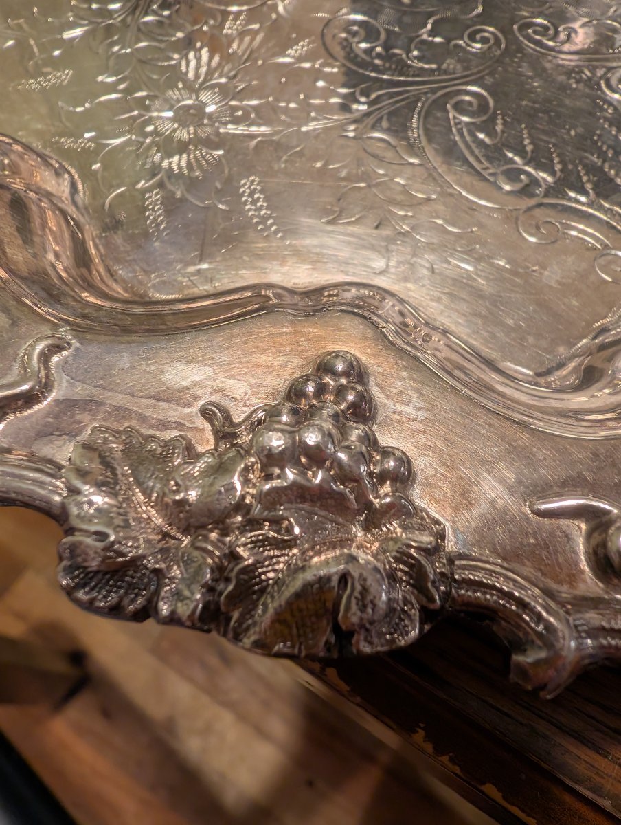 A substantial silver-plated service tray featuring a heavy applied 'Vintage' border of grapes and vine leaves with a hand-chased floral and scrollwork center.