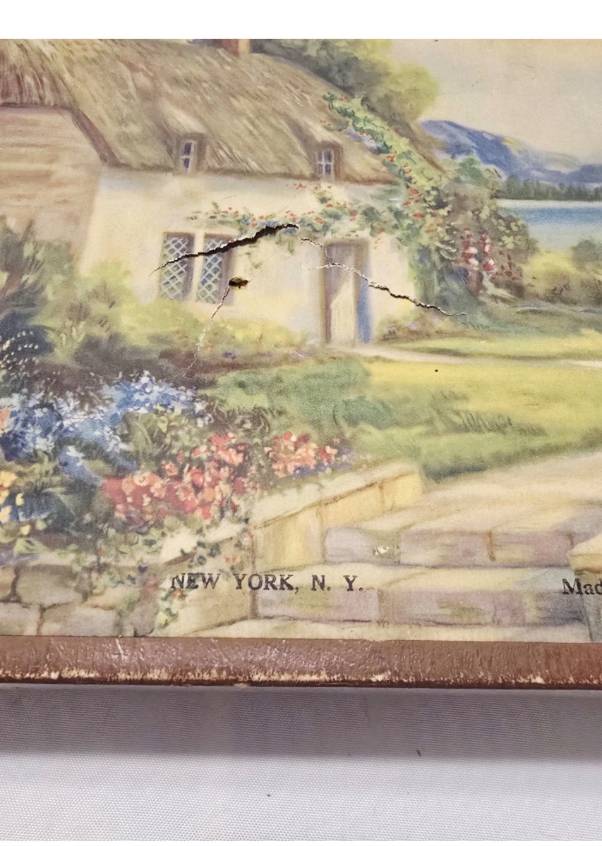 The exterior box lid shows a significant puncture and several tears along the edges, consistent with age and storage. Value is primarily driven by the completeness of the interior components and the graphic appeal of the box.