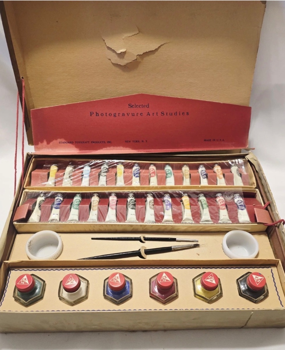 A comprehensive mid-century artist's kit featuring a full spectrum of watercolor tubes, glass ink bottles, and instructional 'Photogravure' art studies.