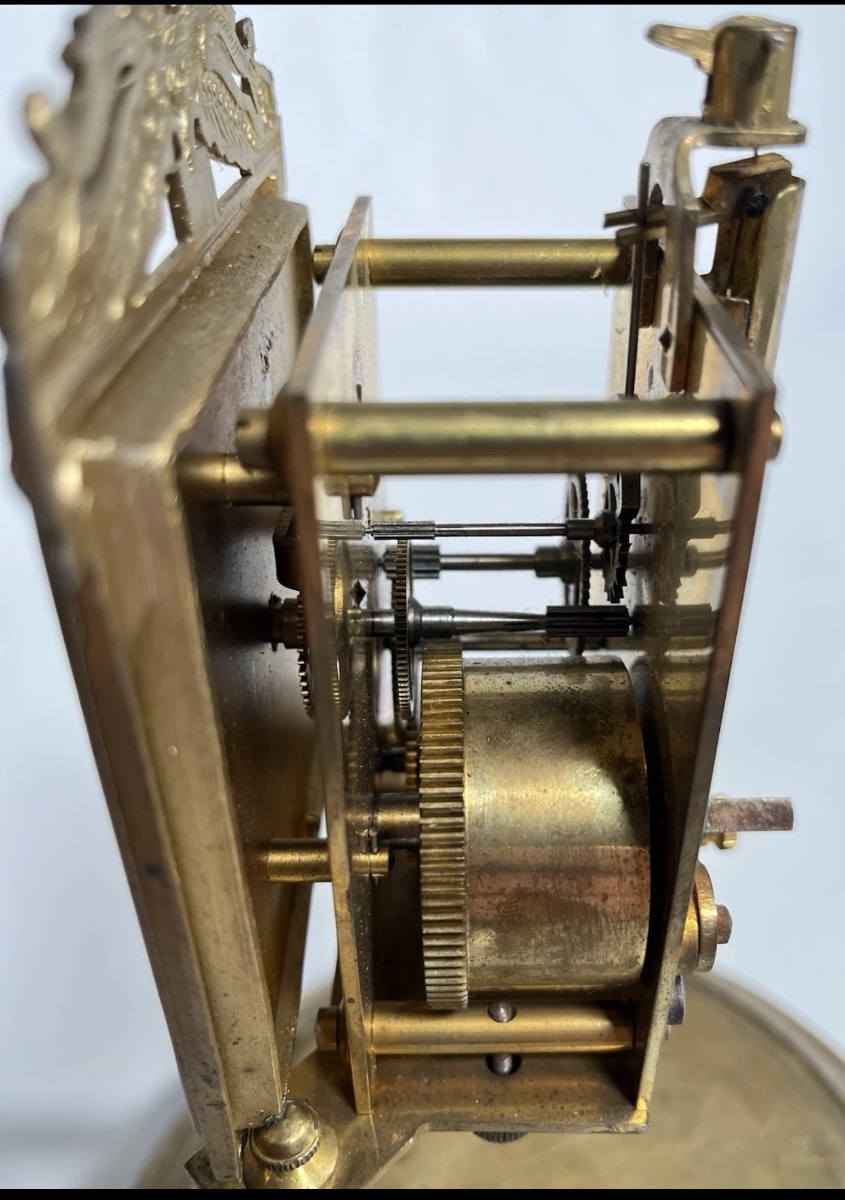 The clock appears to be missing its protective glass dome, which is vital for keeping dust out of the delicate movement. Value is driven by the rare engine-turned dial and the desirable 'Elephant' JUF mark.