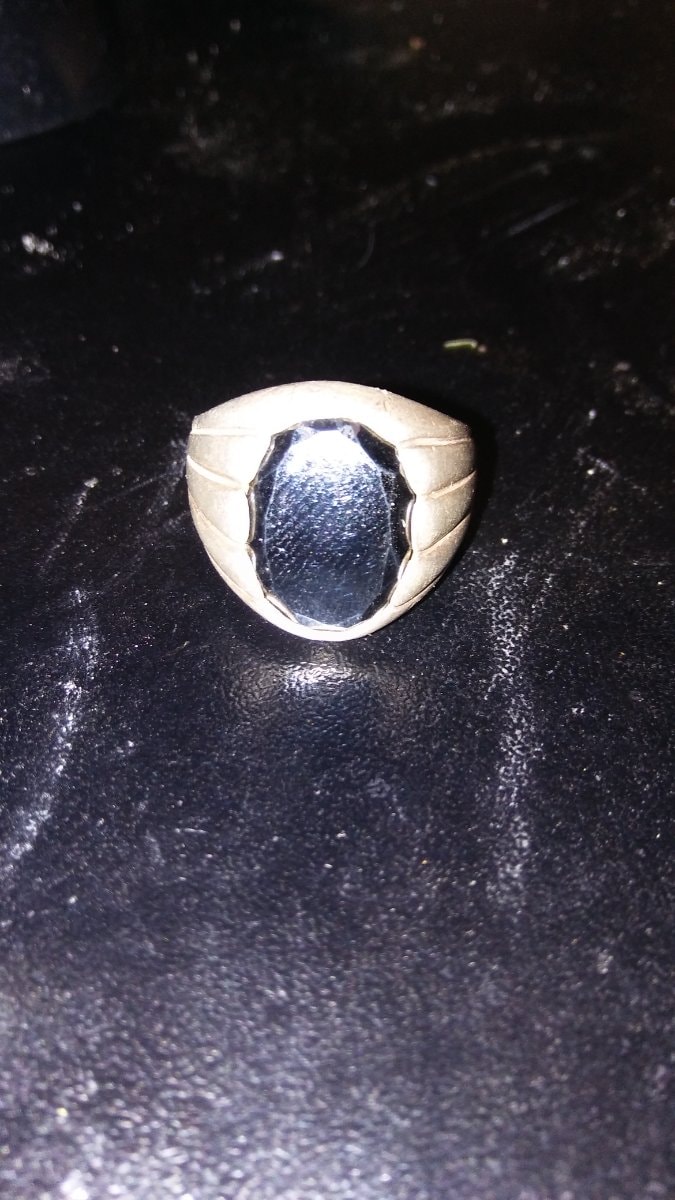 The metal shows a significant patina and surface wear consistent with decades of use, which has given it a soft, matte finish. The hematite stone appears to be in good condition, though close inspection might reveal minor 'flea bites' or abrasions on the facet edges.