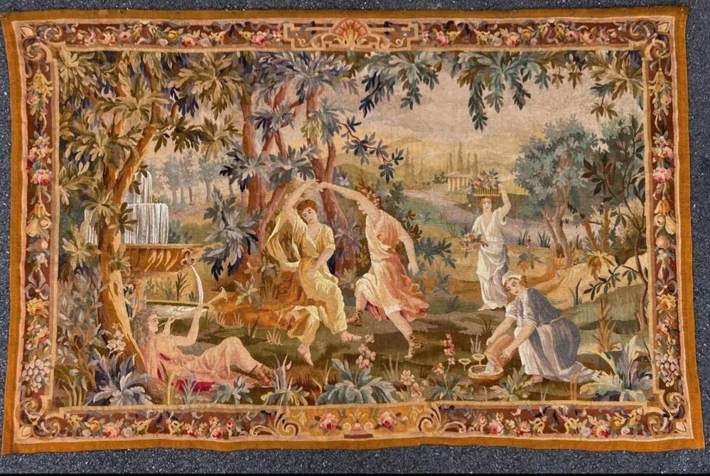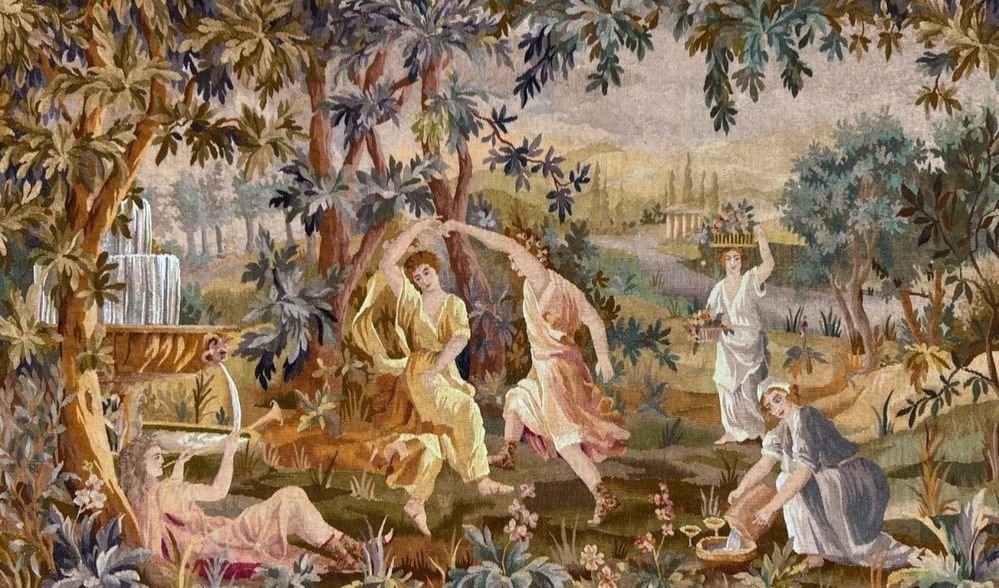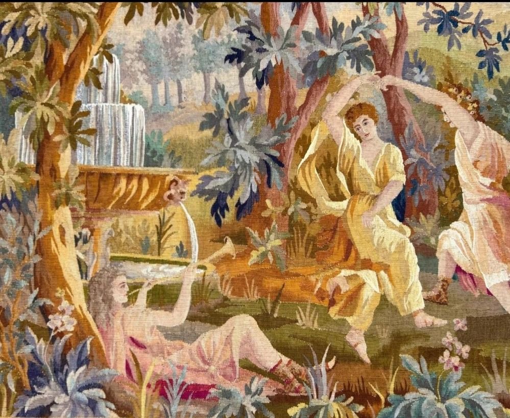 A lush, large-scale textile depicting a 'Fête Champêtre' or pastoral festival, featuring nymphs dancing near a classical fountain.