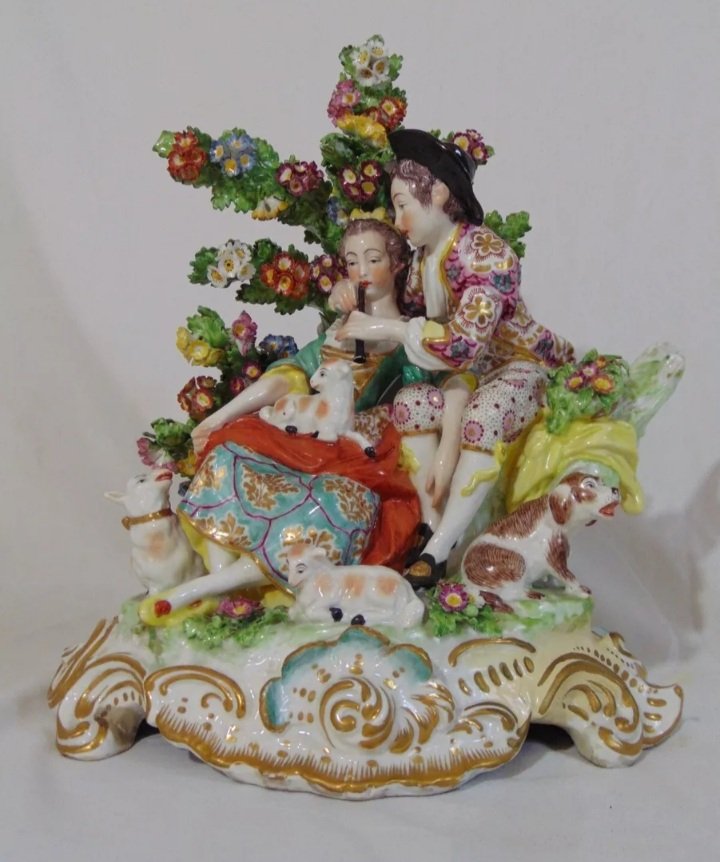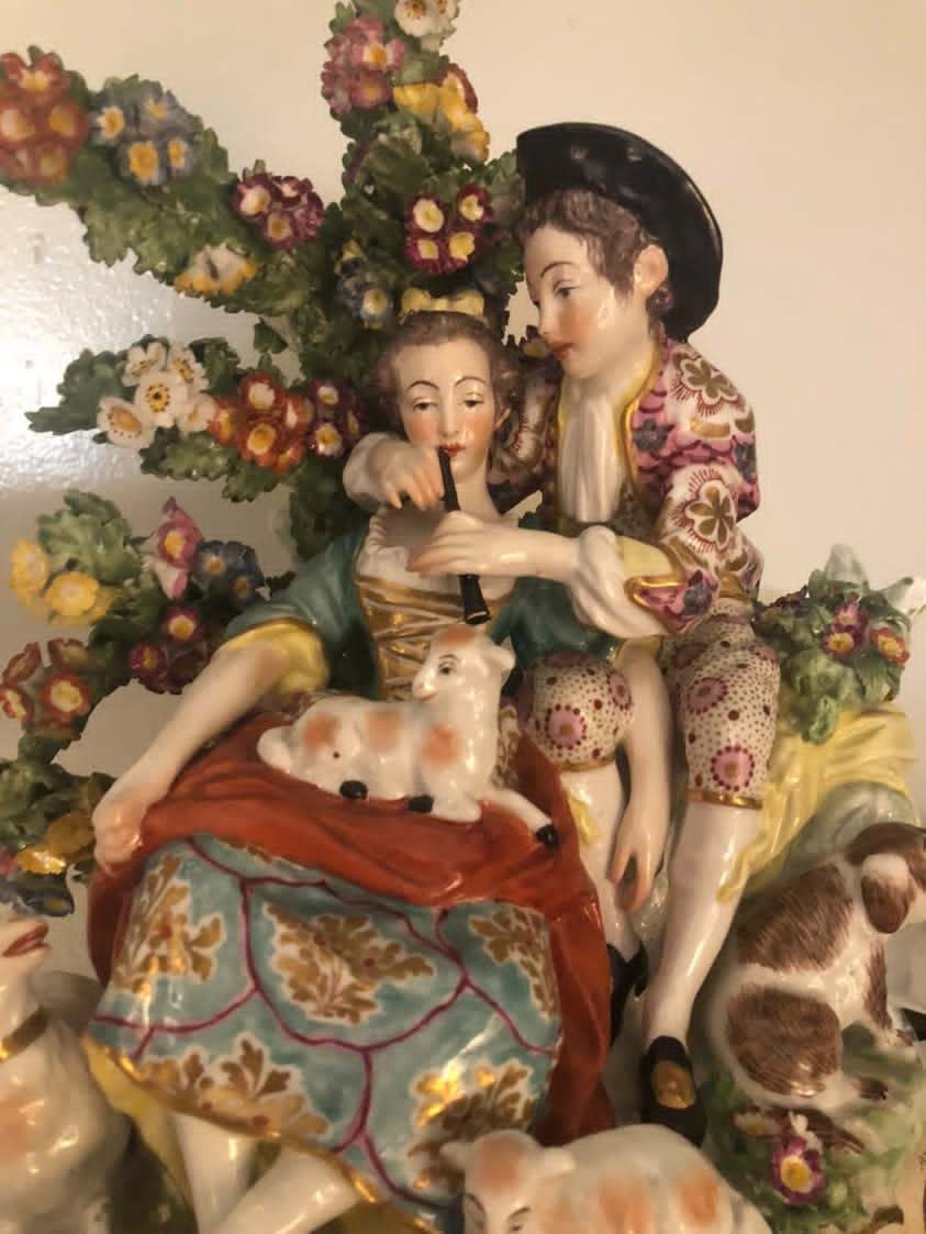 An ambitious and highly decorative porcelain figural group depicting a shepherd and shepherdess in a romantic musical interlude.