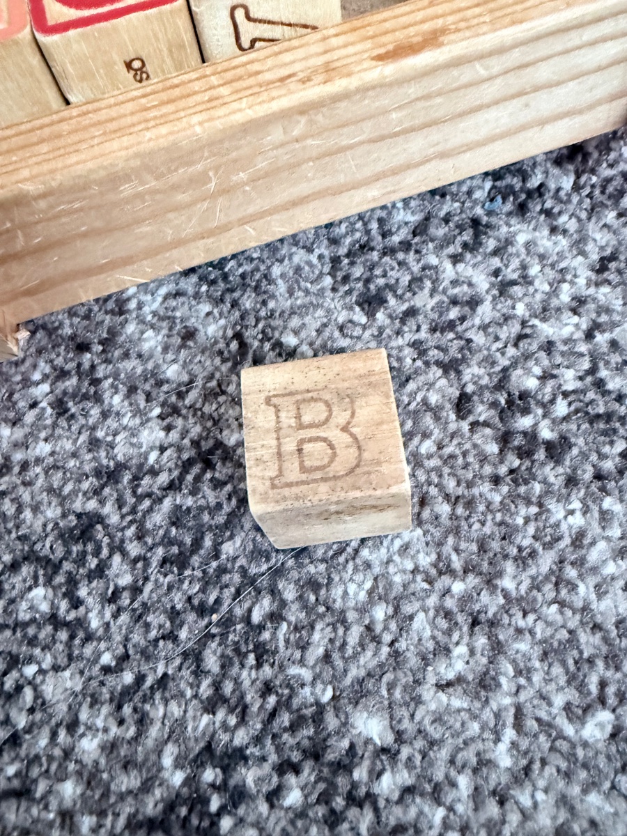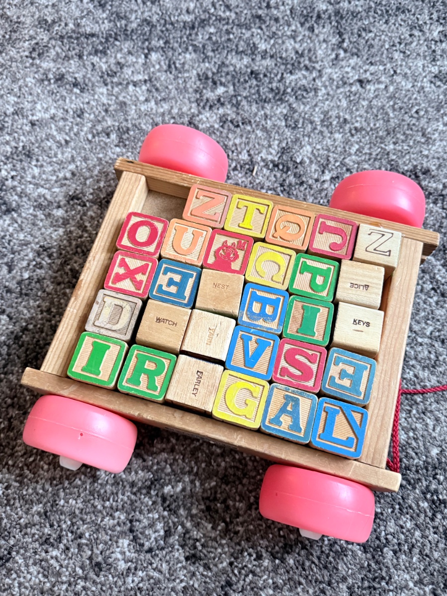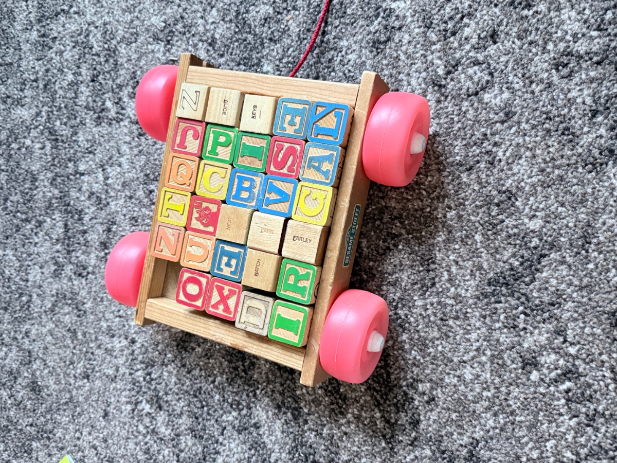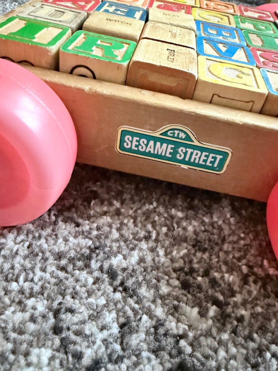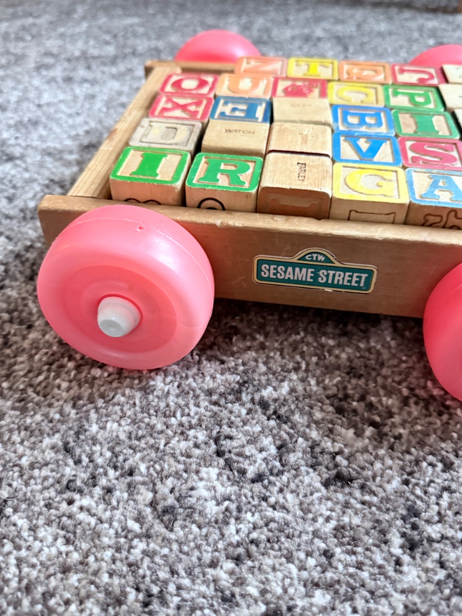 A classic wooden pull-along wagon containing a set of embossed and printed alphabet blocks featuring characters and vocabulary from the iconic Sesame Street television show.