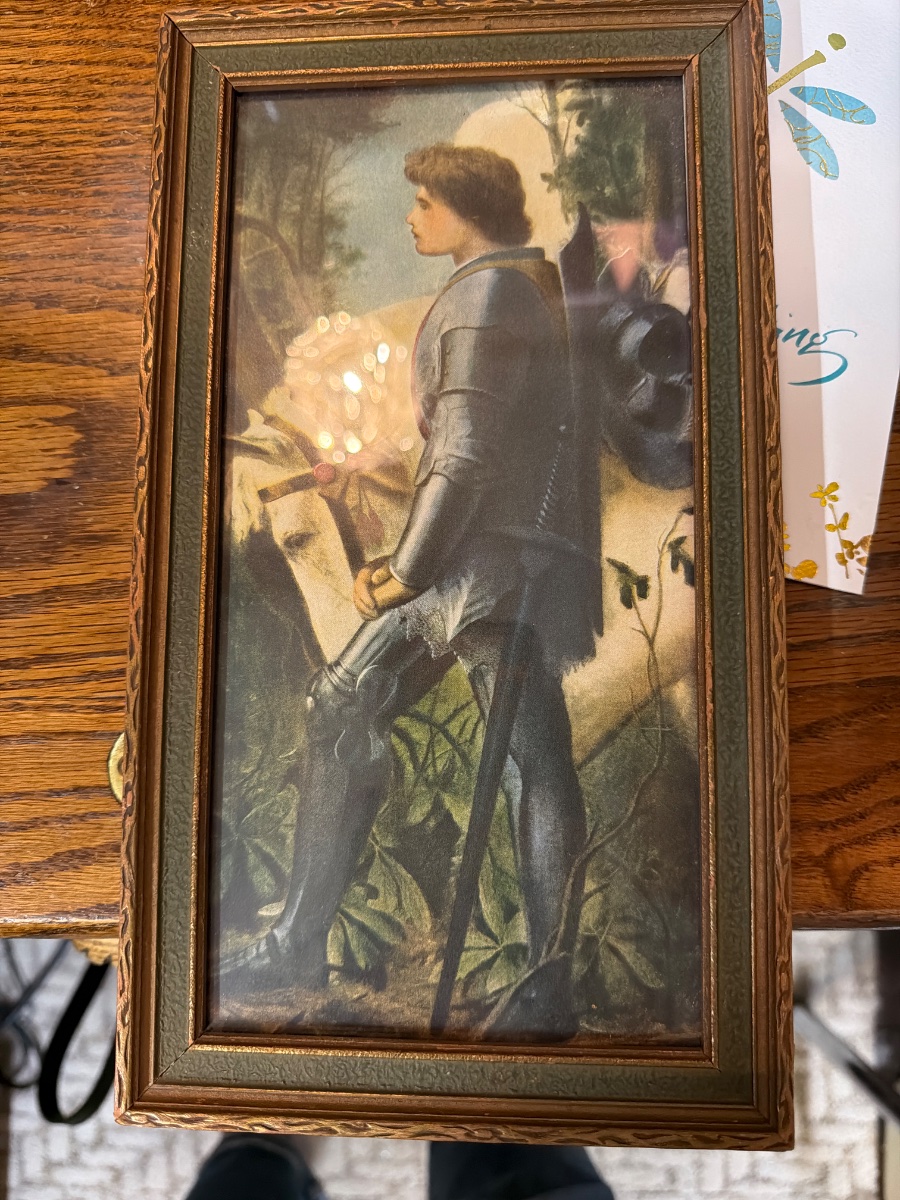 This is a classic early 20th-century lithographic reproduction of George Frederic Watts' famous 1862 painting, 'Sir Galahad.' It is housed in a period-correct 'compo' frame featuring a textured molding and a…