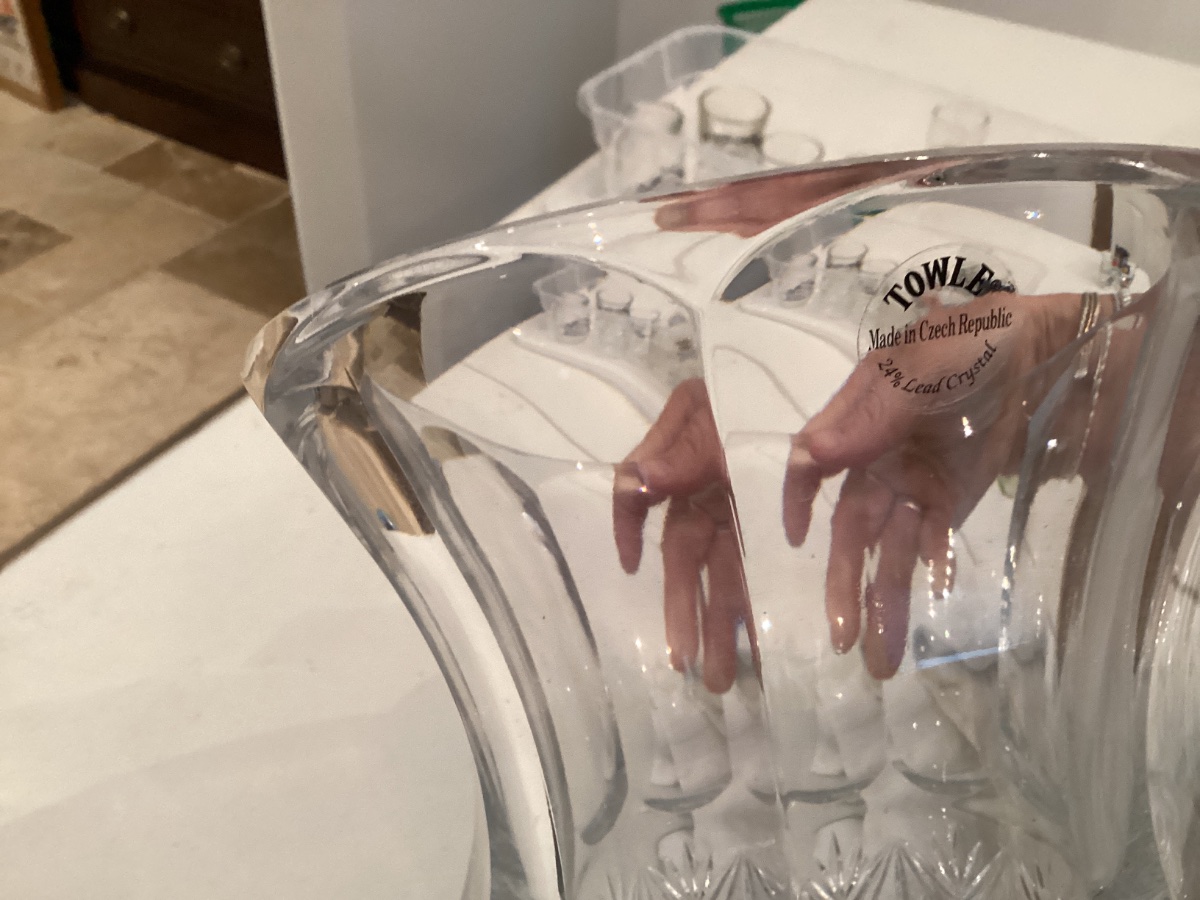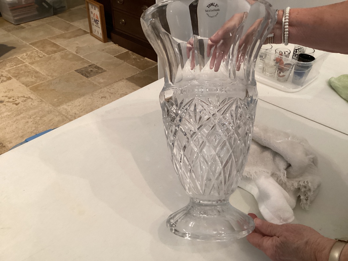 The vase appears to be in excellent condition with the original manufacturer's sticker still intact, which is a great sign it was rarely used. Value for Towle crystal is currently stable, driven primarily by the size of the piece and its condition.