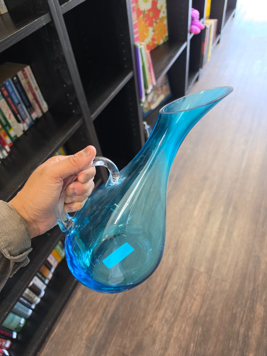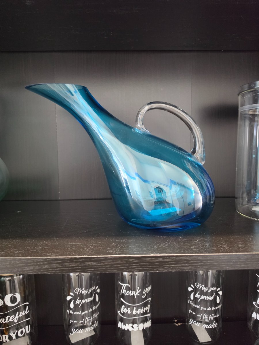 A quintessential piece of American Mid-Century Modern glass featuring a dramatic, elongated 'crane neck' spout and an organic teardrop body.