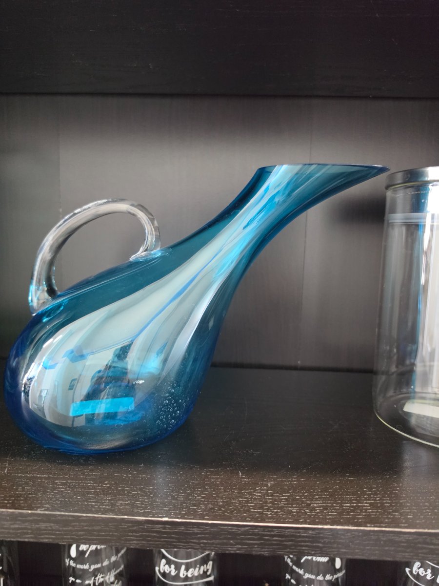 The glass appears remarkably clear with no visible 'sickness' or clouding from hard water. Value is driven by the designer (Wayne Husted pieces are highly sought after) and the condition of the delicate spout.