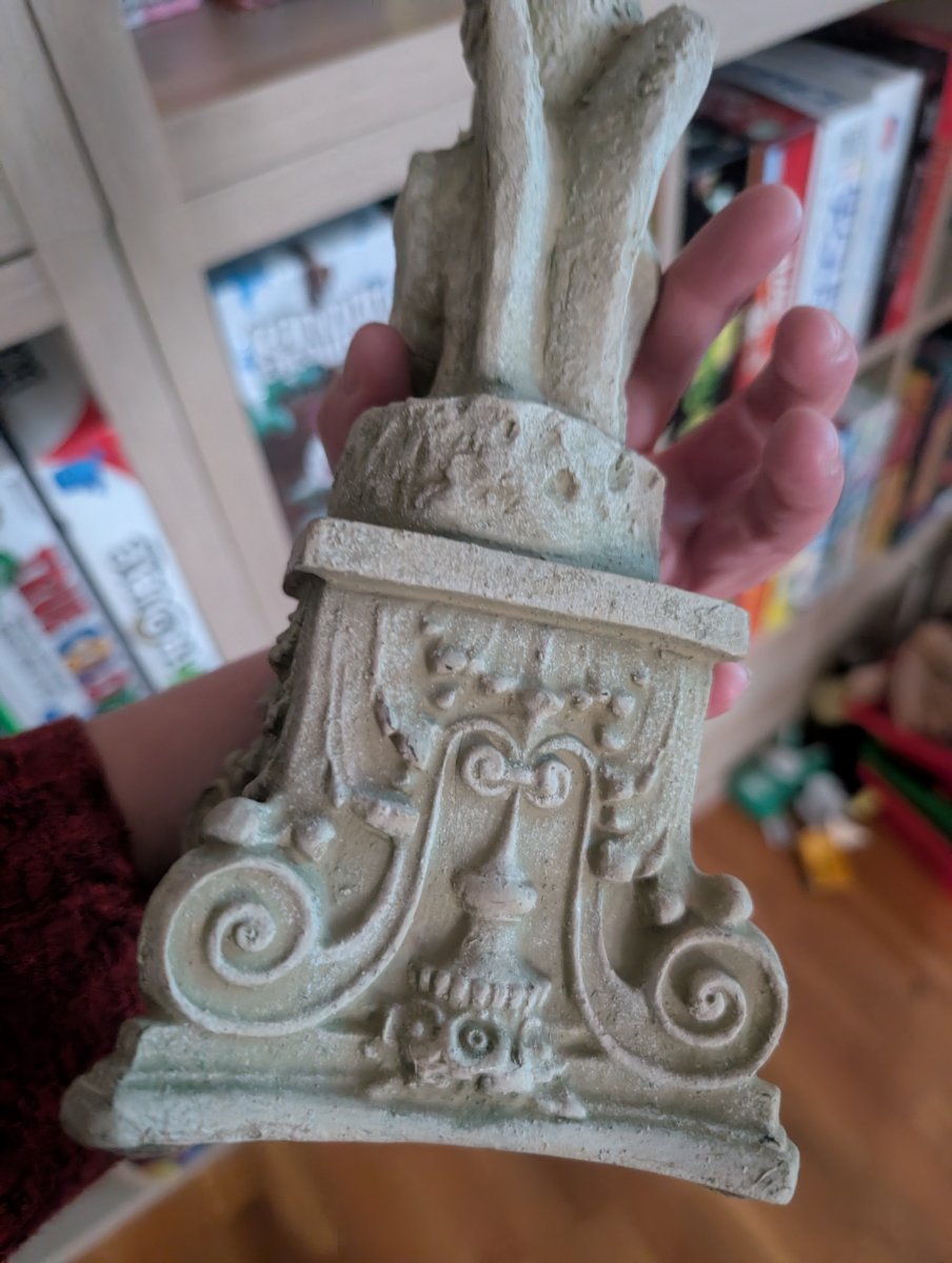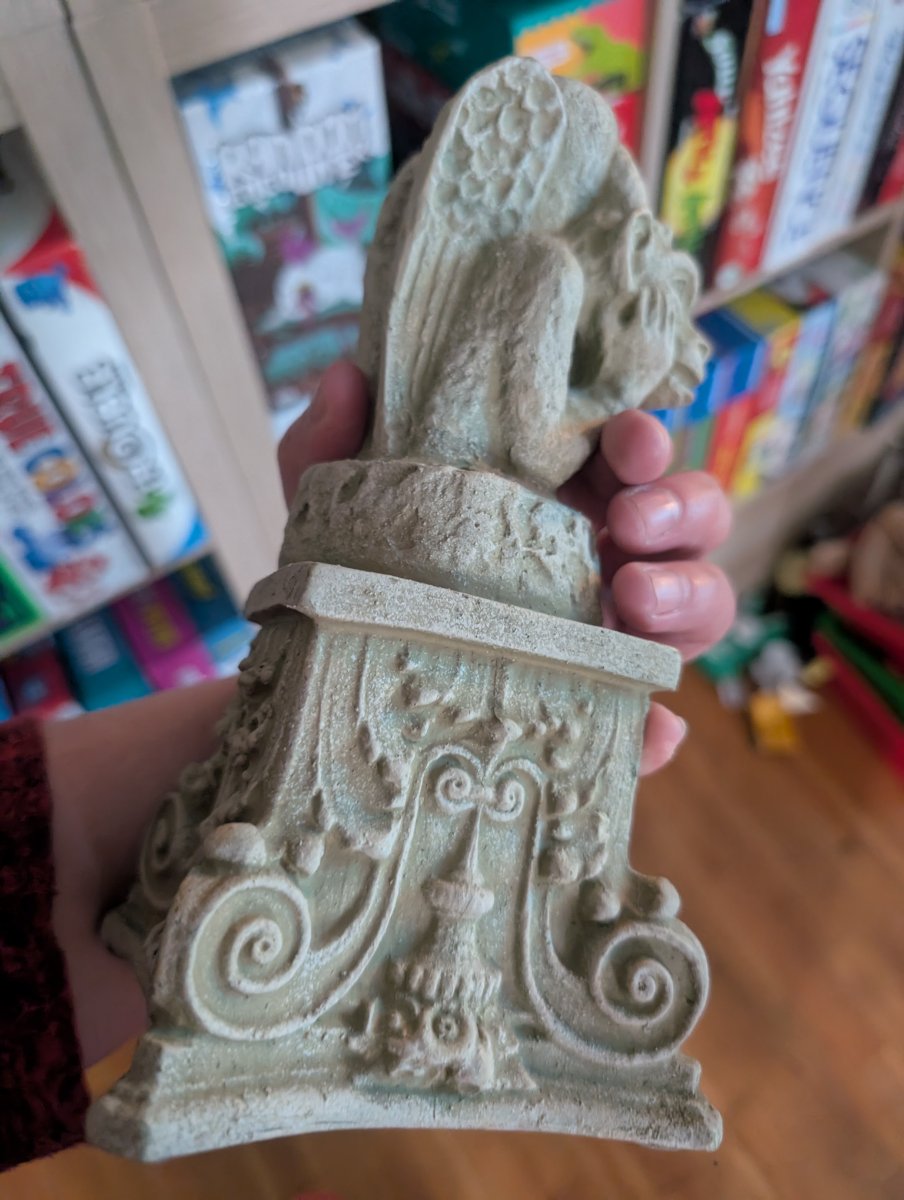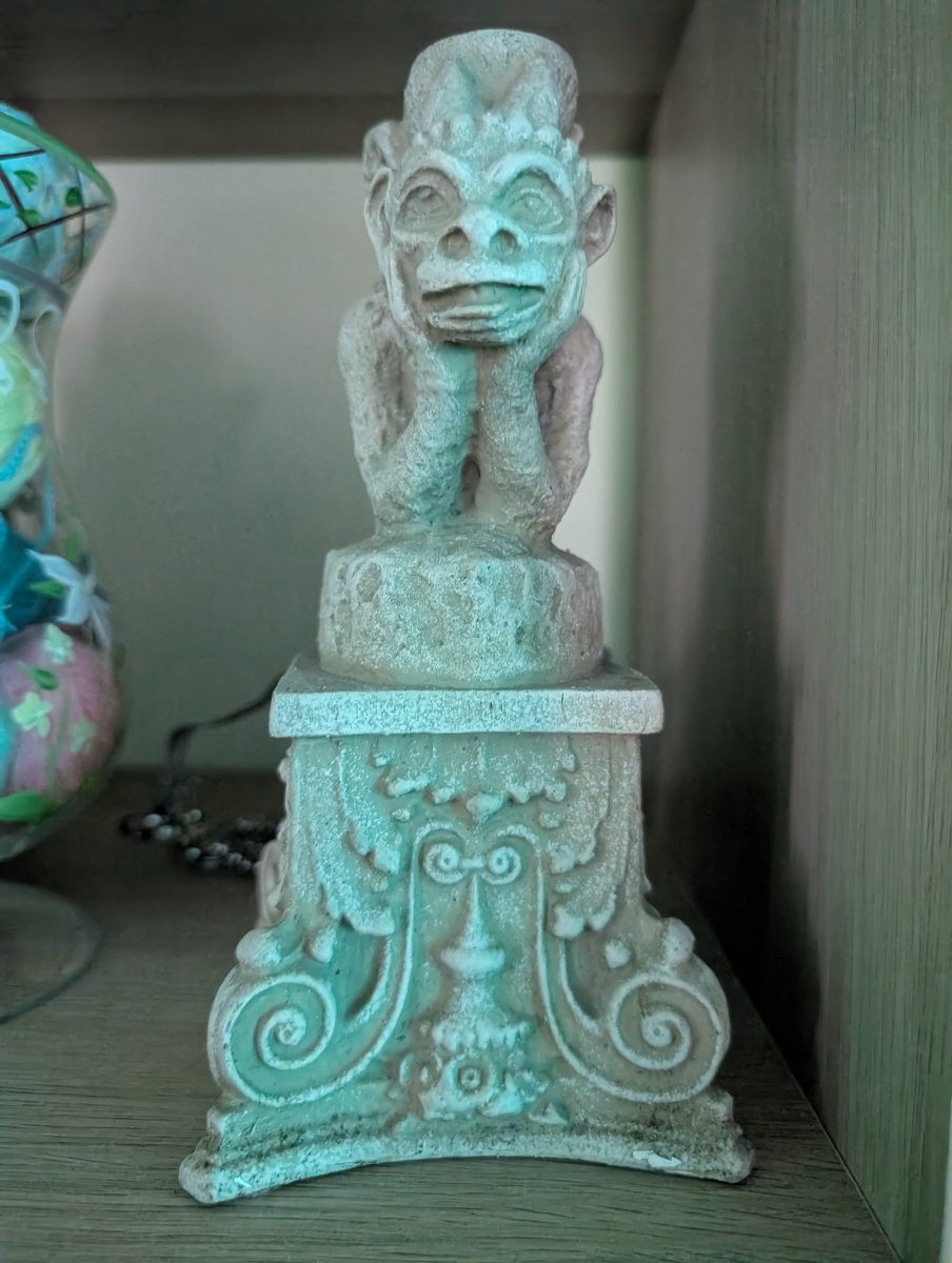 The figure atop this pedestal is a direct homage to 'Le Stryge' (The Stryge), the most famous of the chimeras added to Notre-Dame Cathedral during its 19th-century restoration.