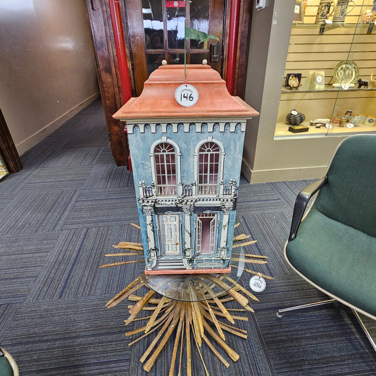 The painted surface appears largely intact with minor scuffing consistent with age and use. Value is driven by the quality of the decorative painting and the 'whimsy factor.' While not a known designer piece, its scale and architectural charm make it a…