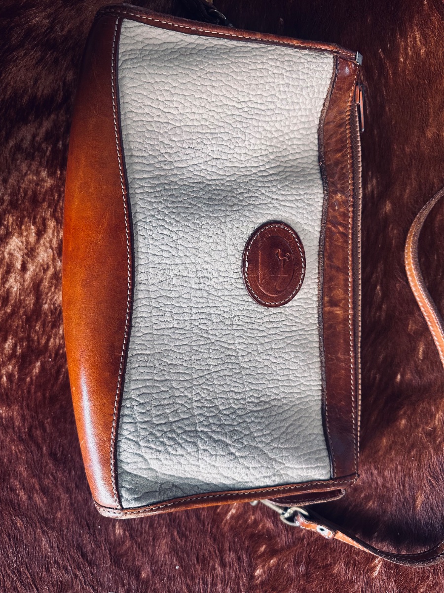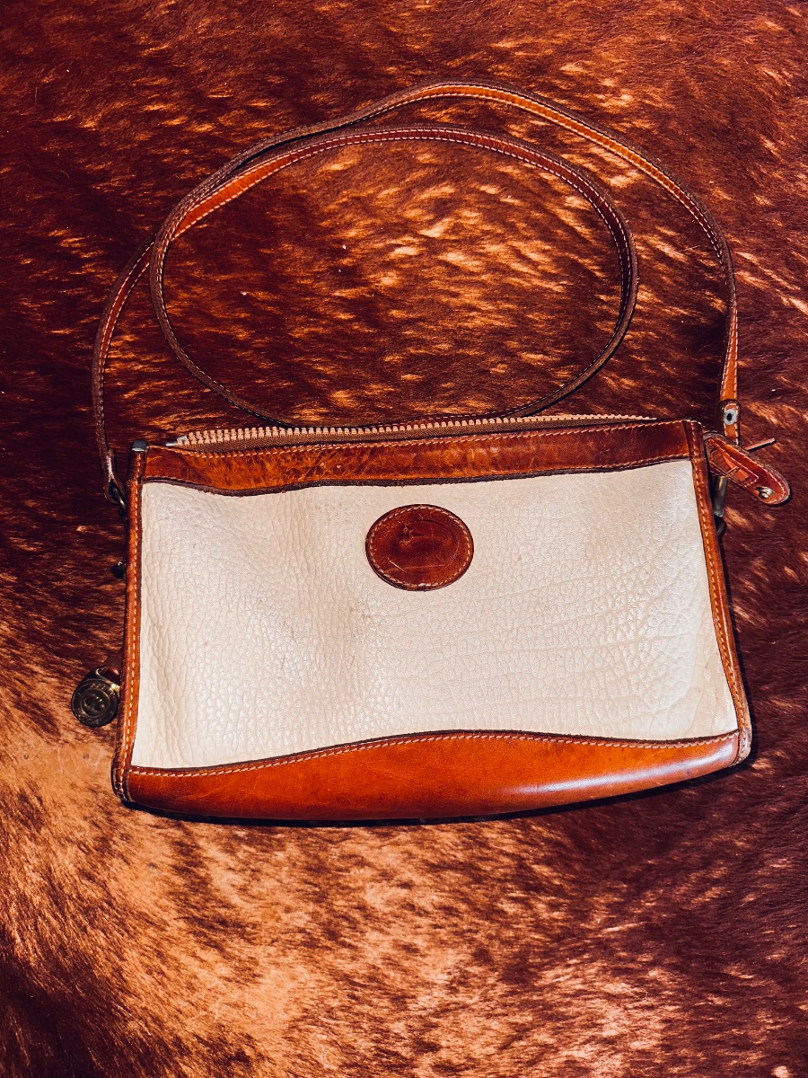 The bag shows significant patina and darkening on the tan bridle leather trim, particularly around the zipper and base. Value for vintage AWL pieces is driven by the presence of the brass duck charm and the cleanliness of the lighter-colored leather.