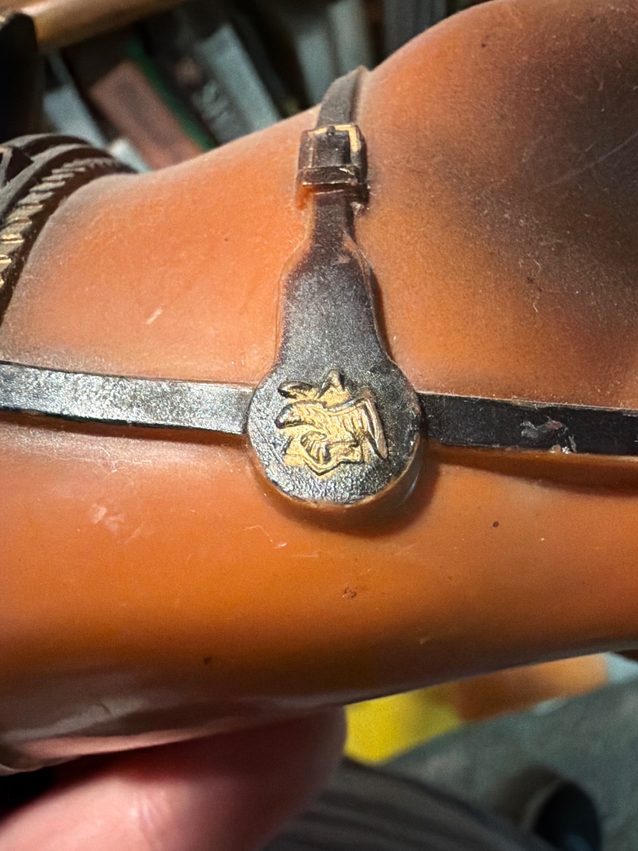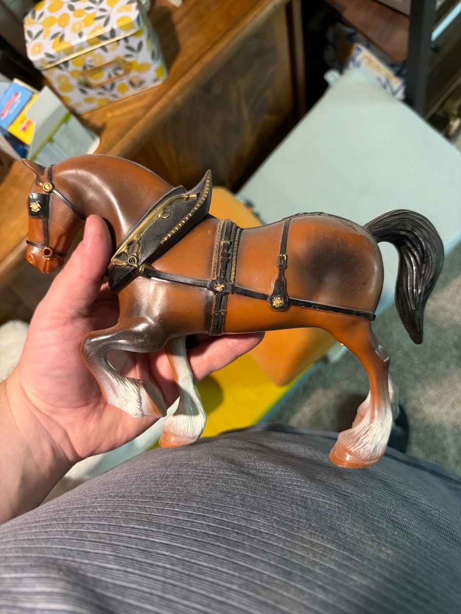 The figurine shows some surface wear and minor paint loss on the harness buckles, which is expected for its age. Standalone promotional models in good condition typically fall in this range; however, if this were part of a complete '8-horse hitch' set with the wagon, the value…
