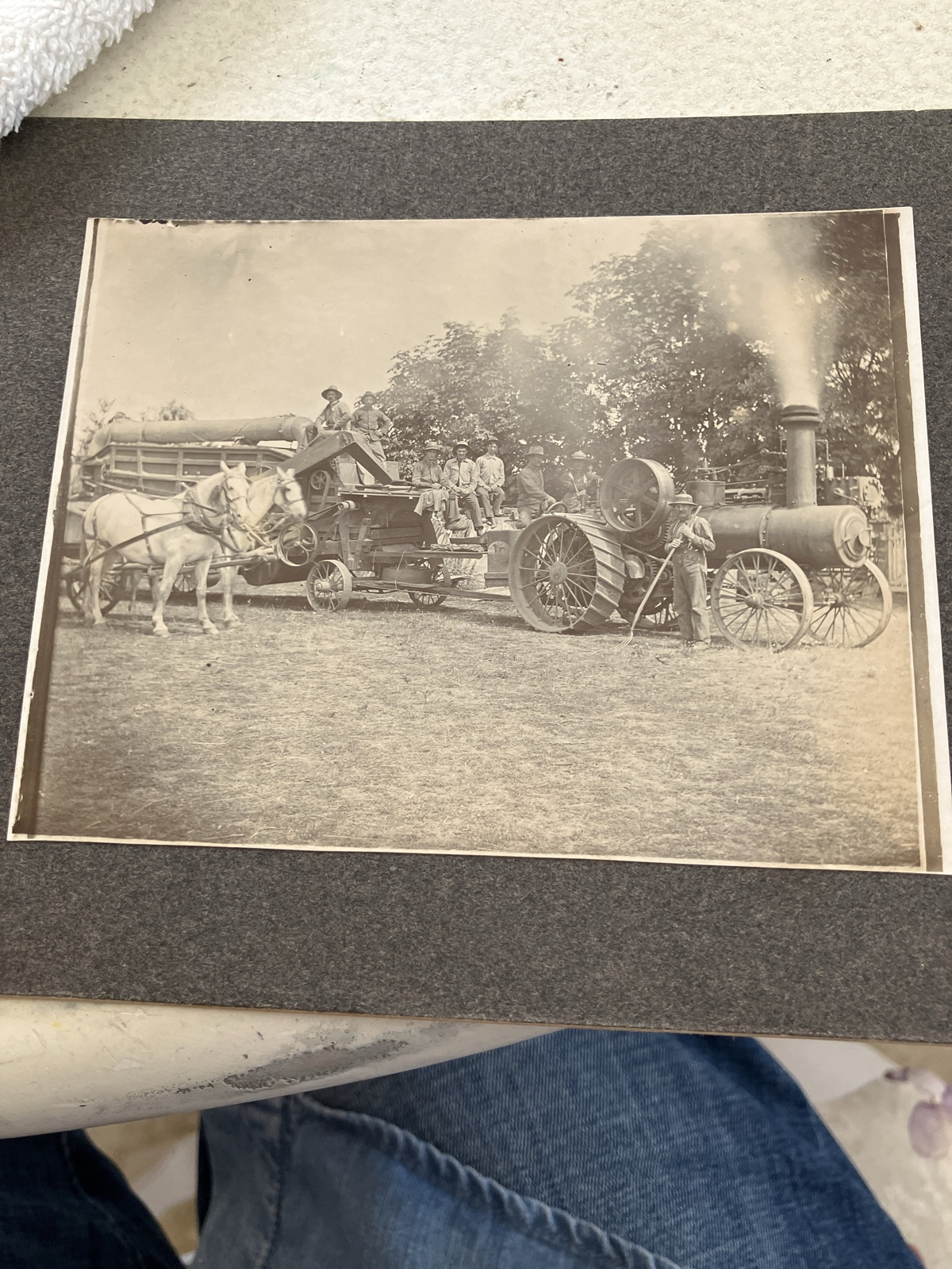 A remarkably clear silver gelatin or albumen print capturing the monumental transition from horsepower to industrial steam in American agriculture.