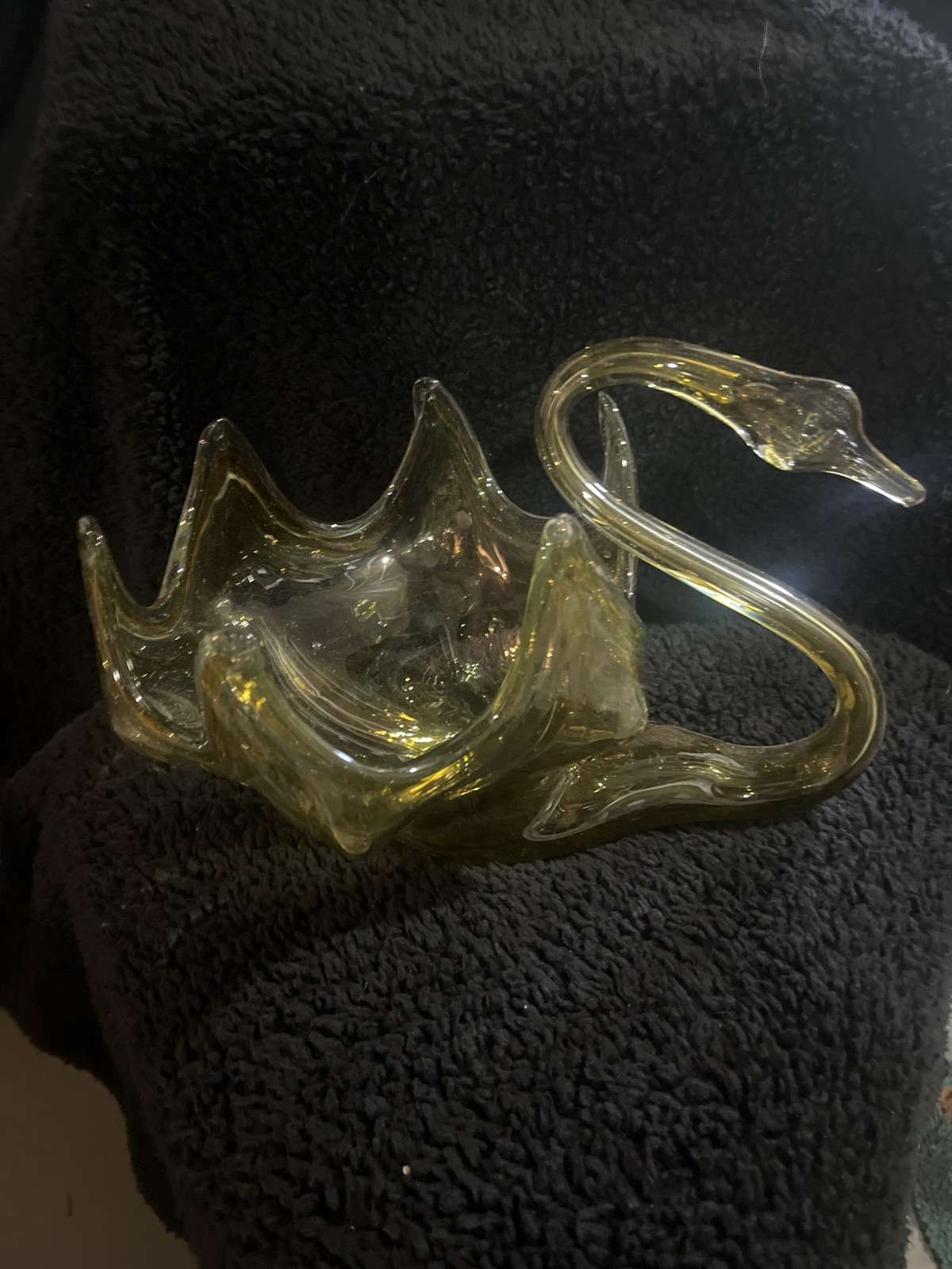 A hand-stretched art glass centerpiece in a warm honey-amber hue, masterfully shaped into the form of a graceful swan.