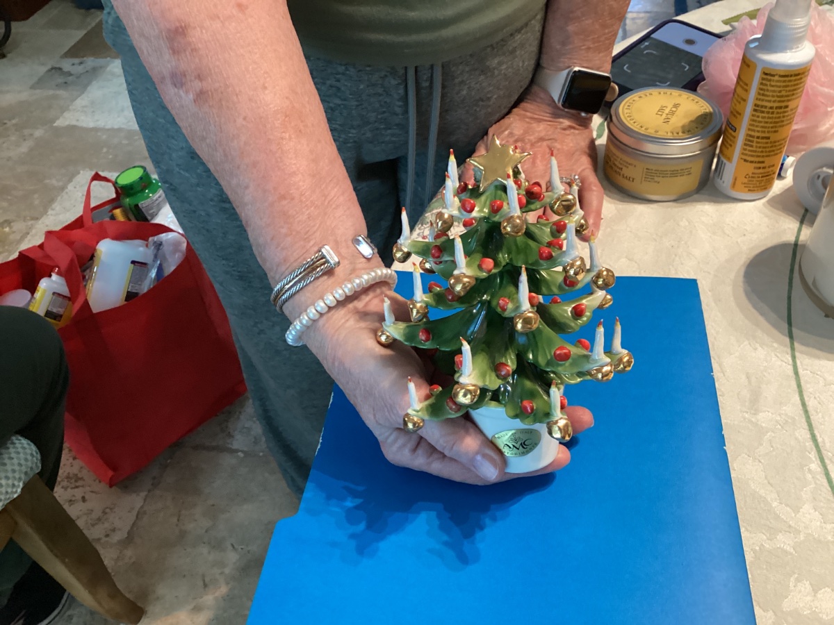 A finely detailed soft-paste porcelain miniature Christmas tree featuring hand-applied candles, gold-gilt ornaments, and a star topper.