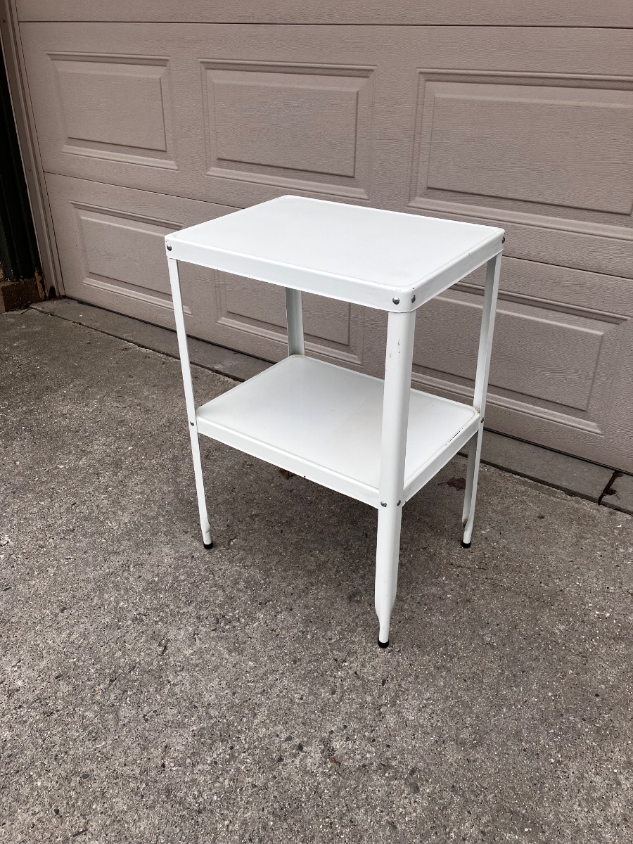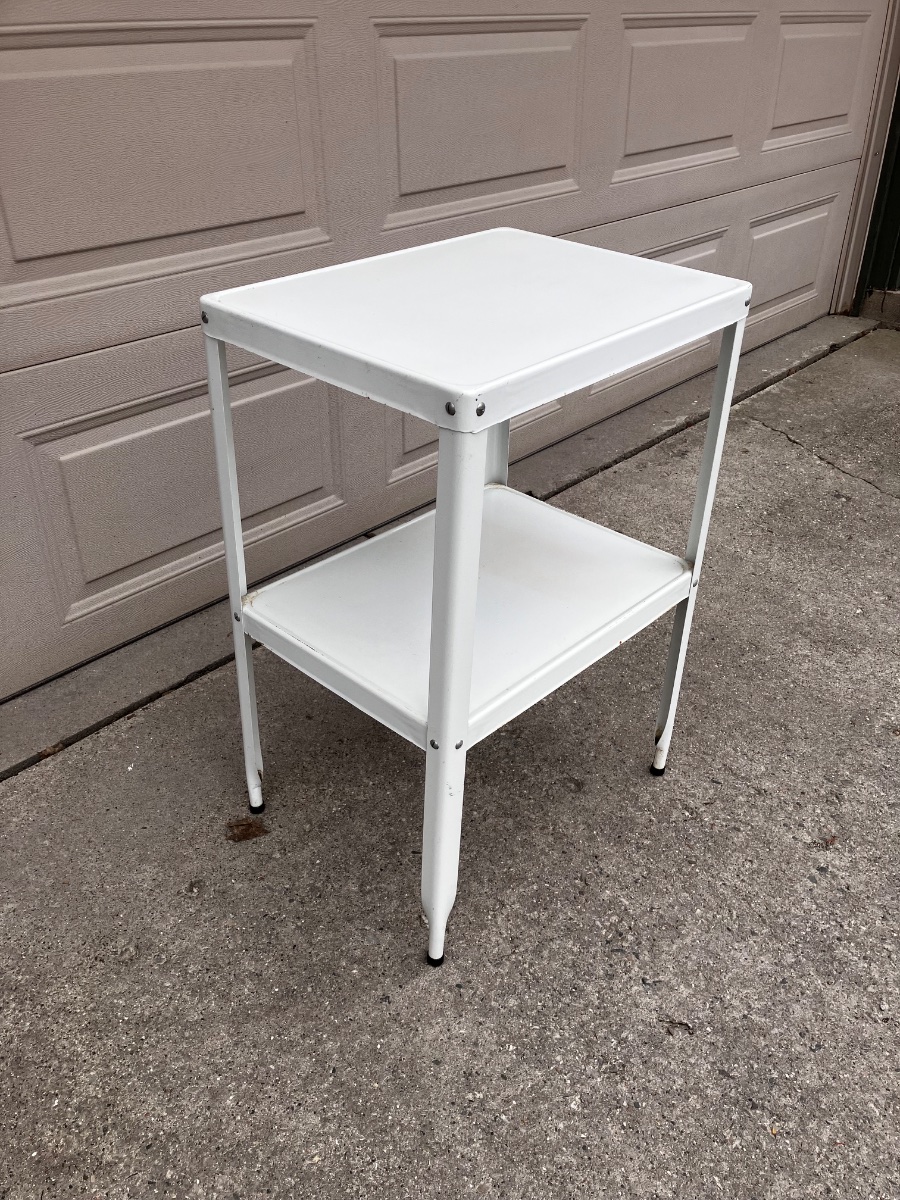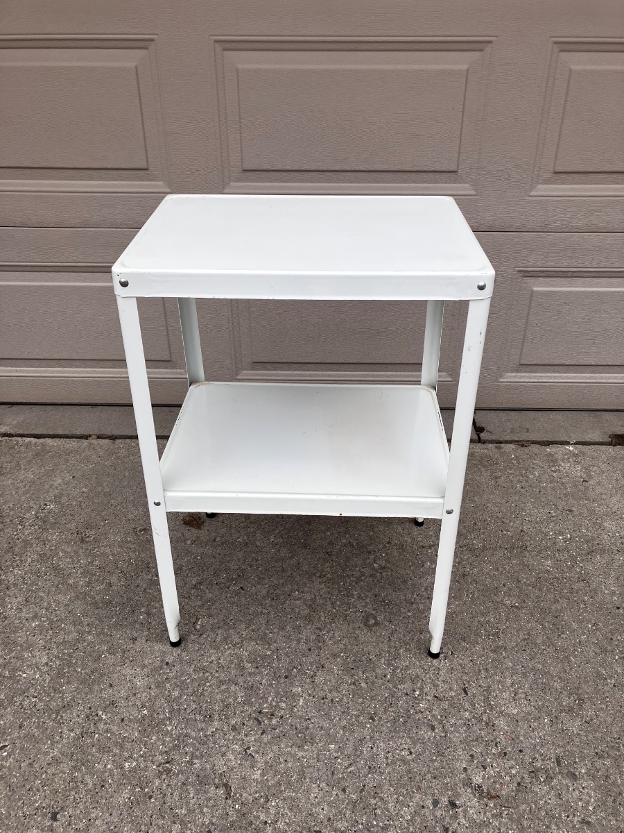 This is a quintessential piece of mid-century functionalism, a two-tier steel utility stand designed for extreme durability and hygiene.