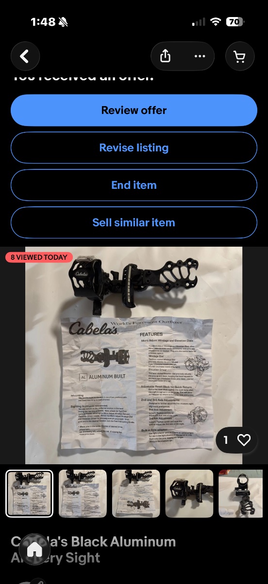 The sight appears to be in very good used condition with minimal finish wear. The instruction sheet, while wrinkled, is complete and legible. While highly functional, older archery sights are often superseded by newer carbon-fiber models.