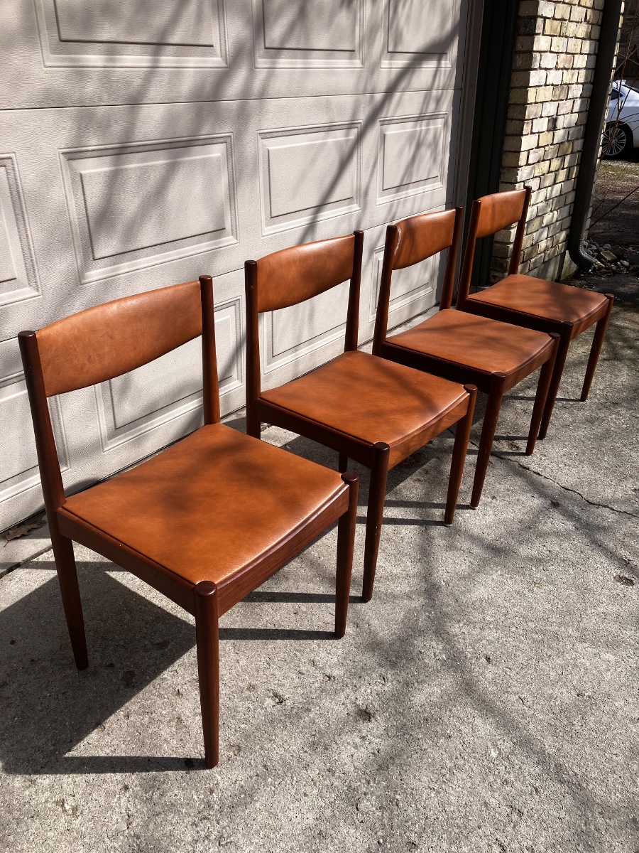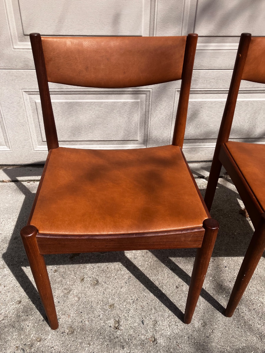 A stunning set of four Danish Modern dining chairs featuring sculptural teak frames and rich cognac upholstery.