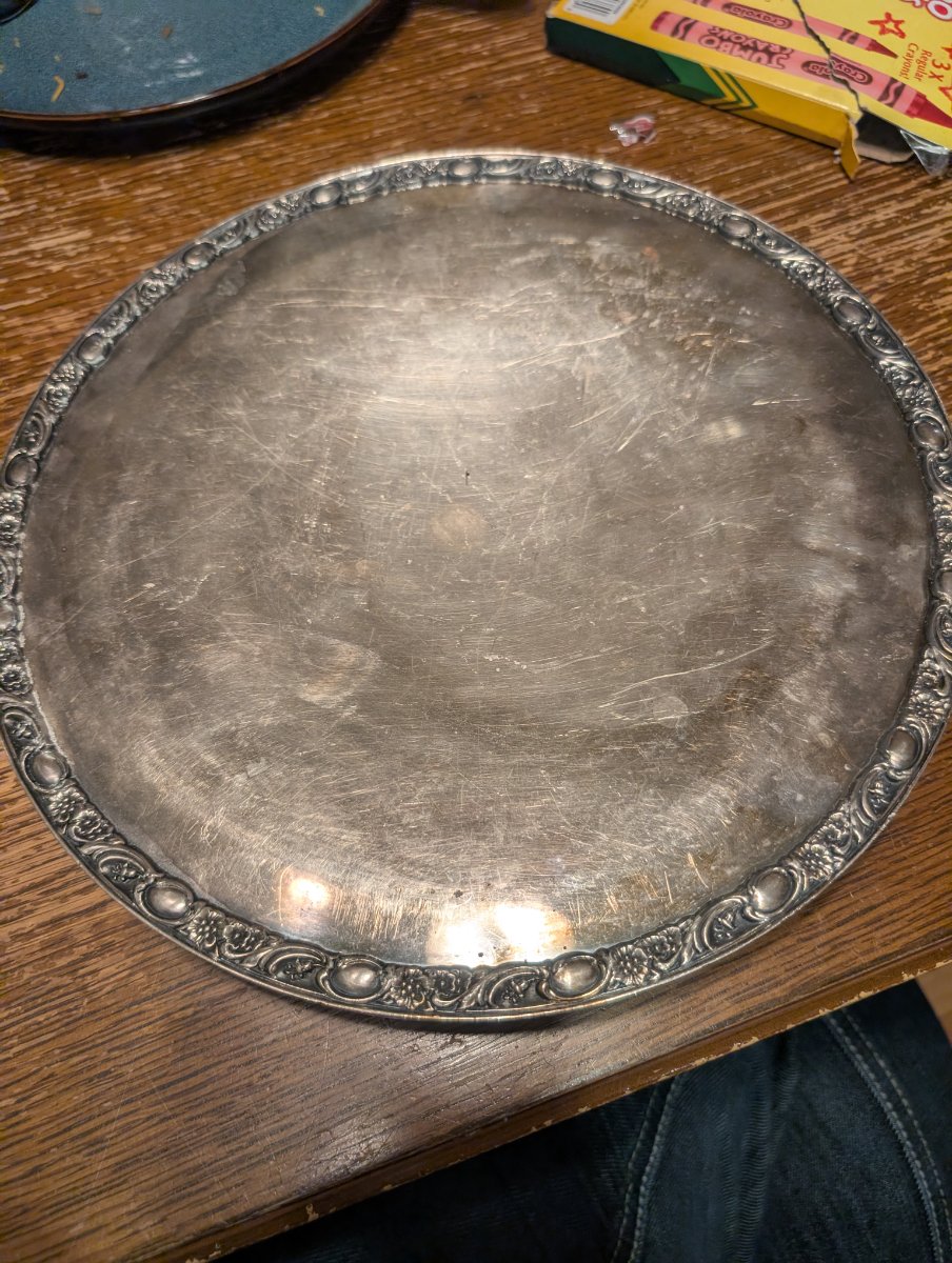 The tray shows significant surface scratching and 'swirl' marks from heavy use or improper cleaning with abrasive materials. Silverplate trays in this pattern are very common; value is driven by size and the condition of the silver plating.