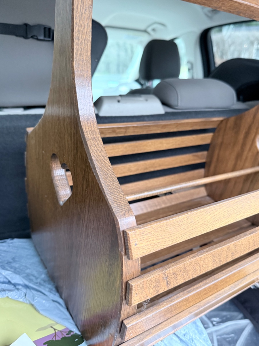 The piece appears to be in very good vintage condition with a consistent finish and no visible structural damage to the slats. Value is driven primarily by the current 'Cottagecore' and 'Grandmillennial' design trends which have brought 1980s country decor back into fashion.