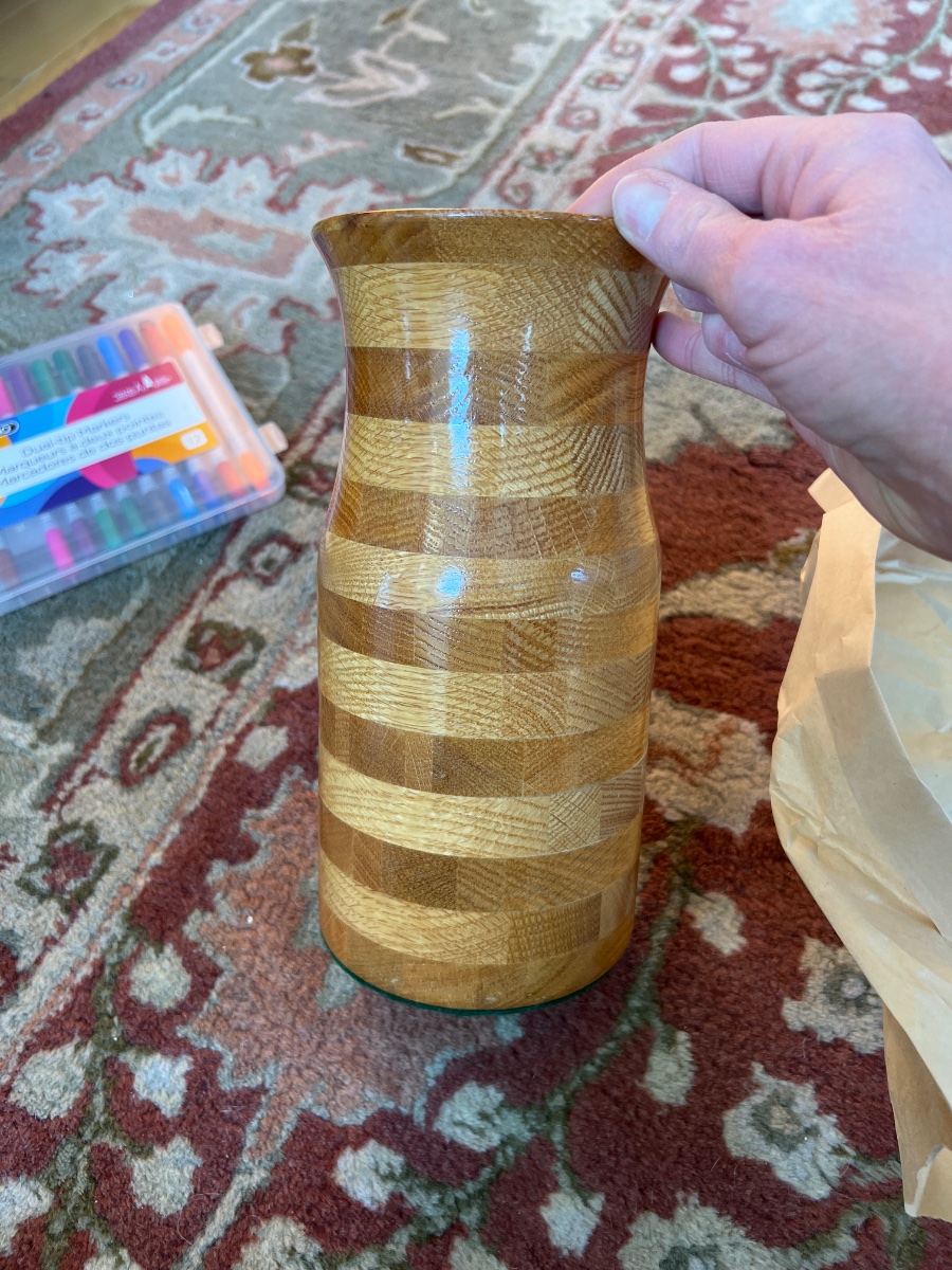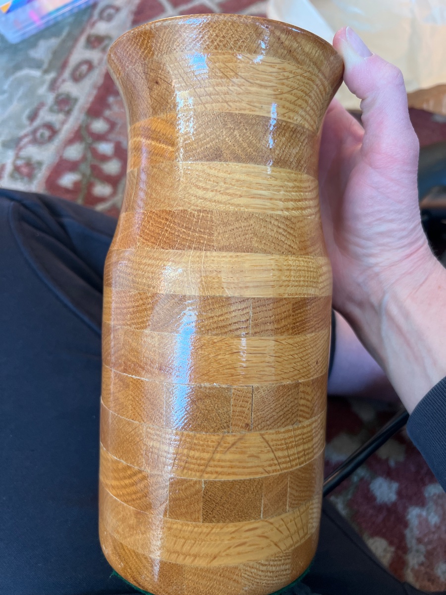 A meticulously assembled vessel created through the 'segmented turning' process, featuring dozens of individual oak blocks glued in a brick-lay pattern.