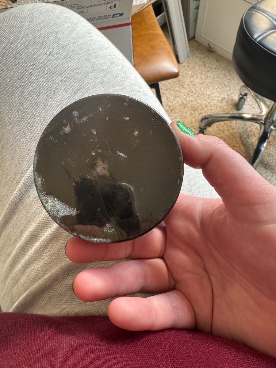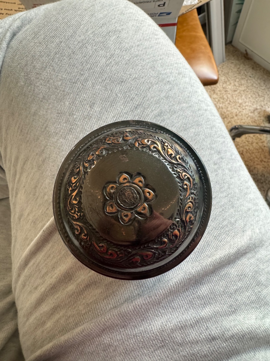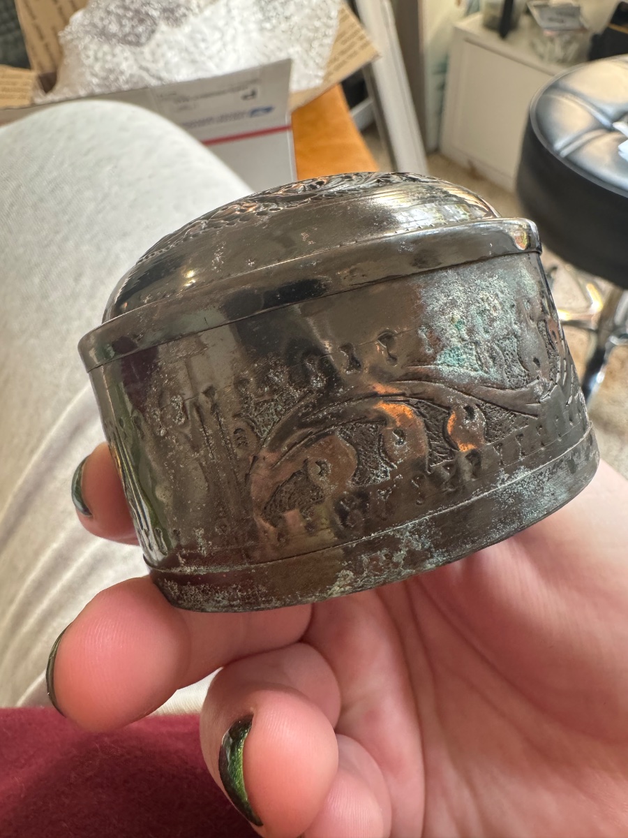 The piece shows heavy oxidation and significant verdigris (green corrosion) on the sides and base. The value is driven by its decorative appeal as a 'relic' piece.