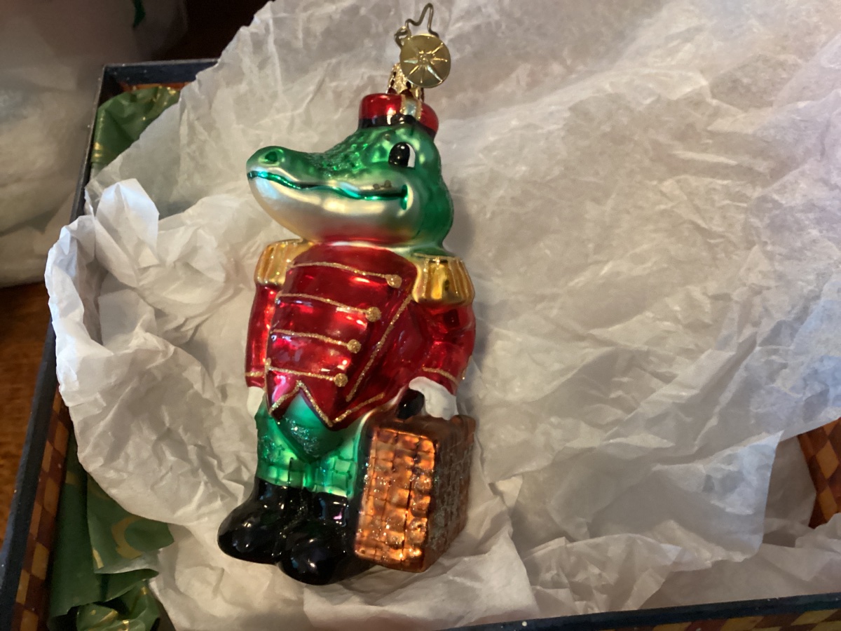 A vibrant, hand-painted mercury glass ornament featuring a whimsical alligator dressed as a bellhop or traveler.