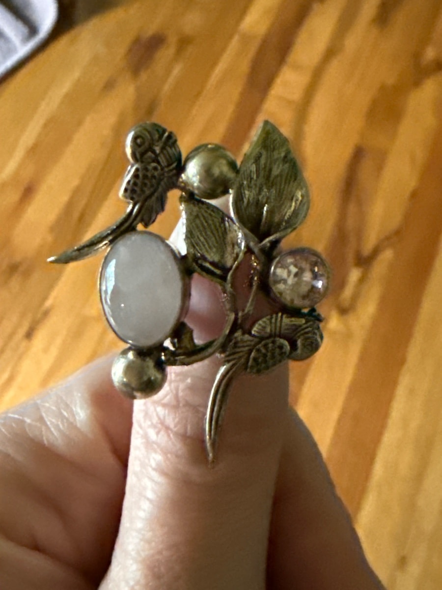The metal shows a soft, aged patina and some surface wear consistent with a piece that was loved and worn. The stones appear secure, though there is some minor visible wear to the smaller accent stone's setting.