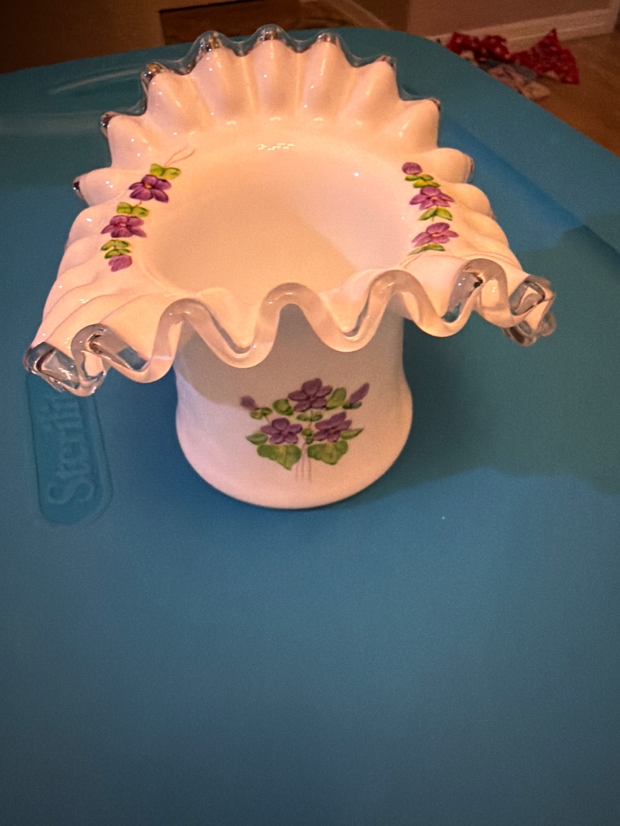 The glass appears vibrant with no visible chips to the delicate ruffled edge, which is the most common area for damage. Value is driven by the popularity of the 'Violets in the Snow' pattern and the condition of the delicate ruffled edge.