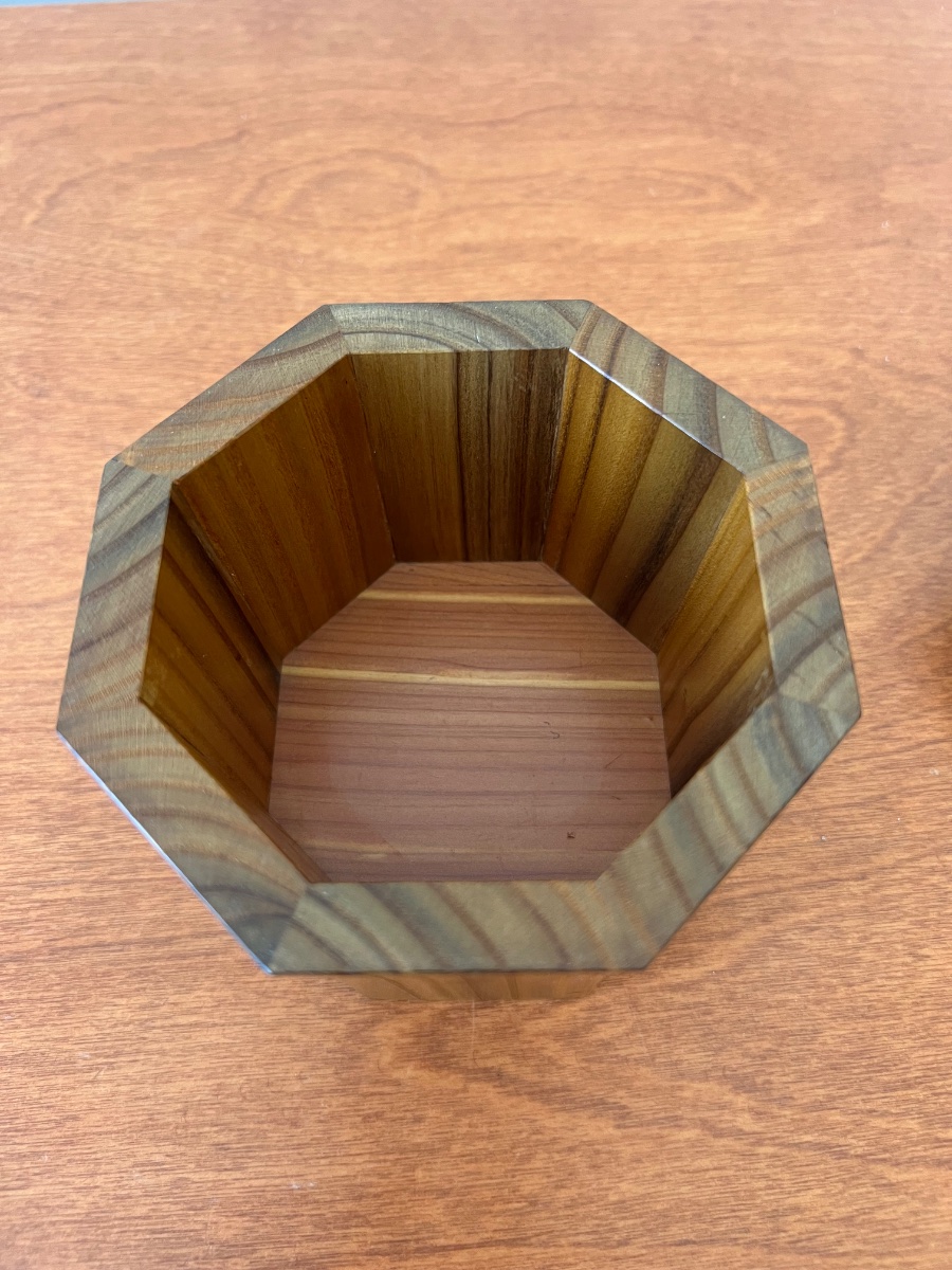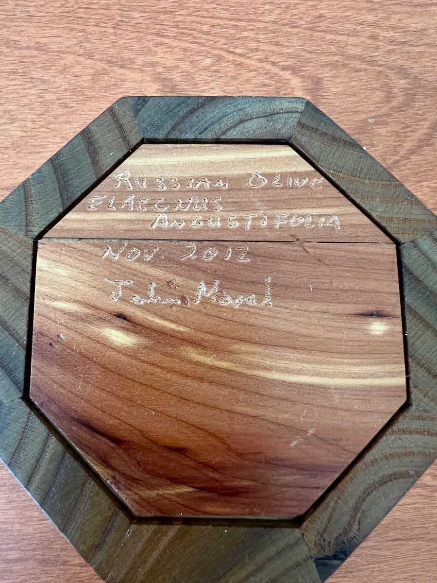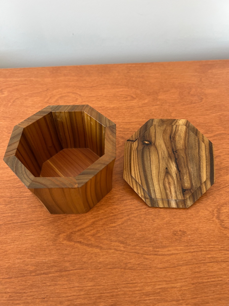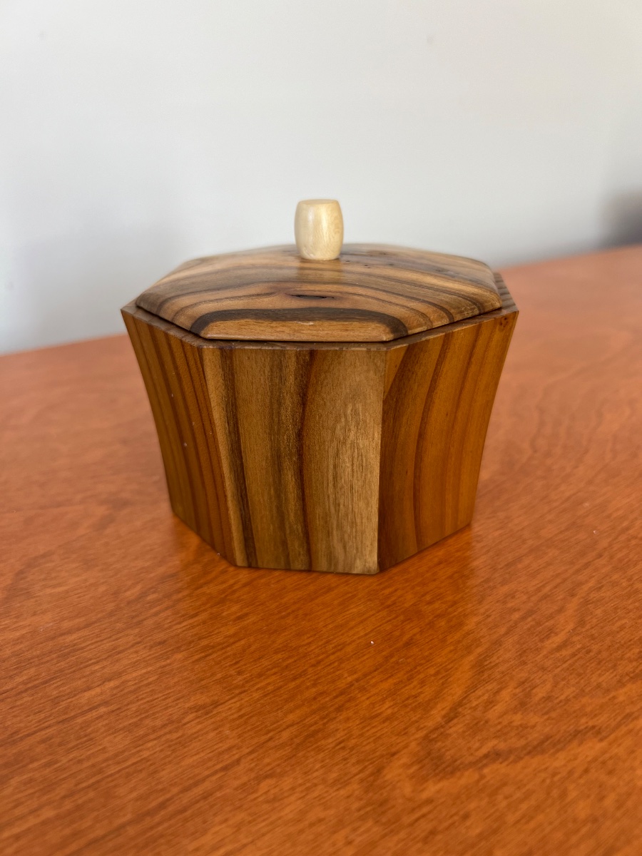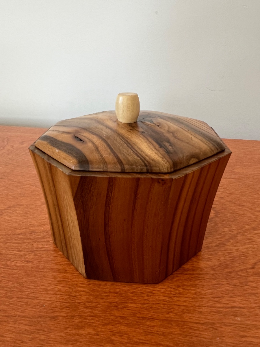 A precision-joined hexagonal vessel crafted from the striking, variegated timber of the Russian Olive tree.