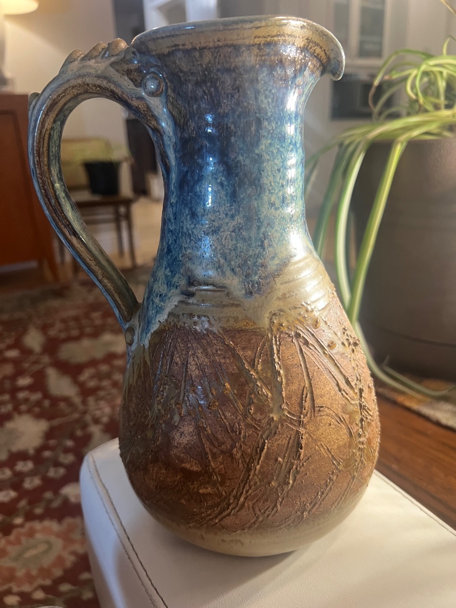 A masterful hand-thrown stoneware pitcher featuring a distinctive 'vertebrae' or notched handle and a dramatic two-tone glaze.
