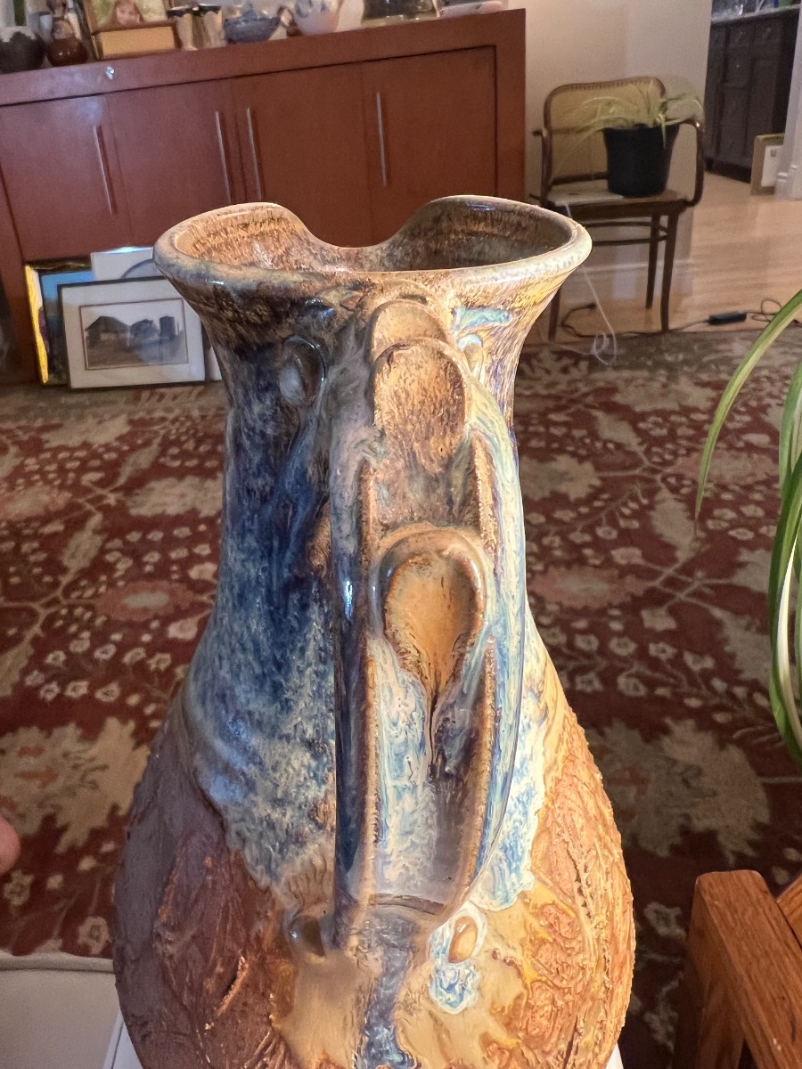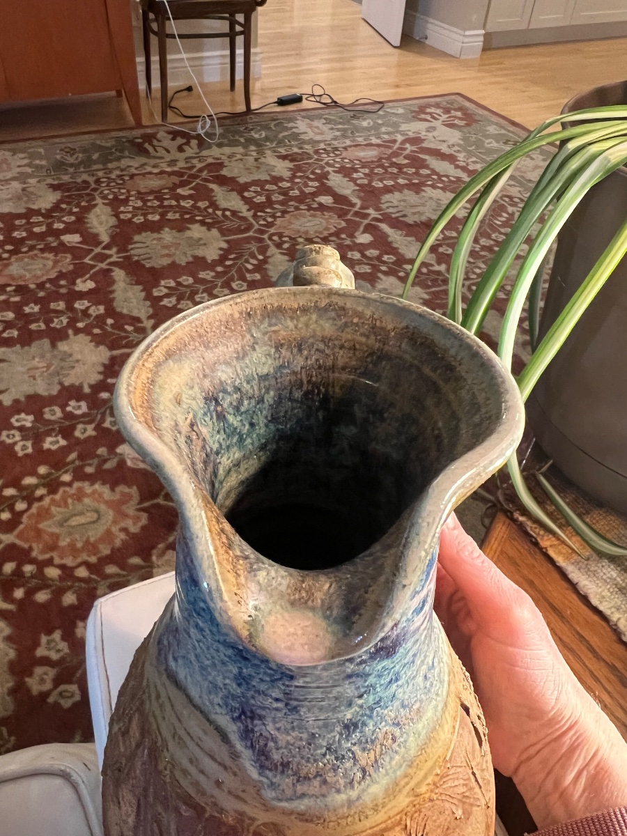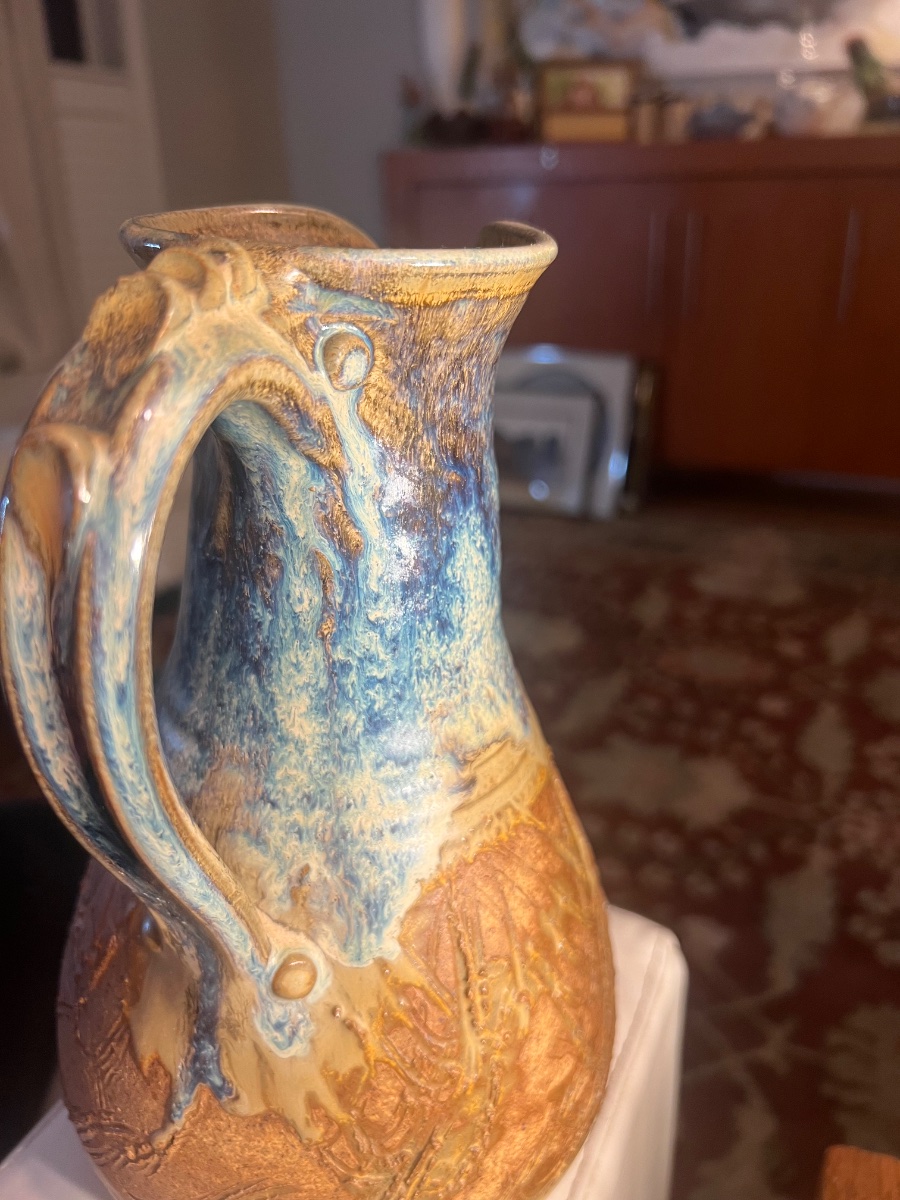 Based on the photos, the pitcher appears to be in excellent vintage condition with no visible chips, cracks, or significant glaze wear. Value is driven by the maker's reputation and the complexity of the form.