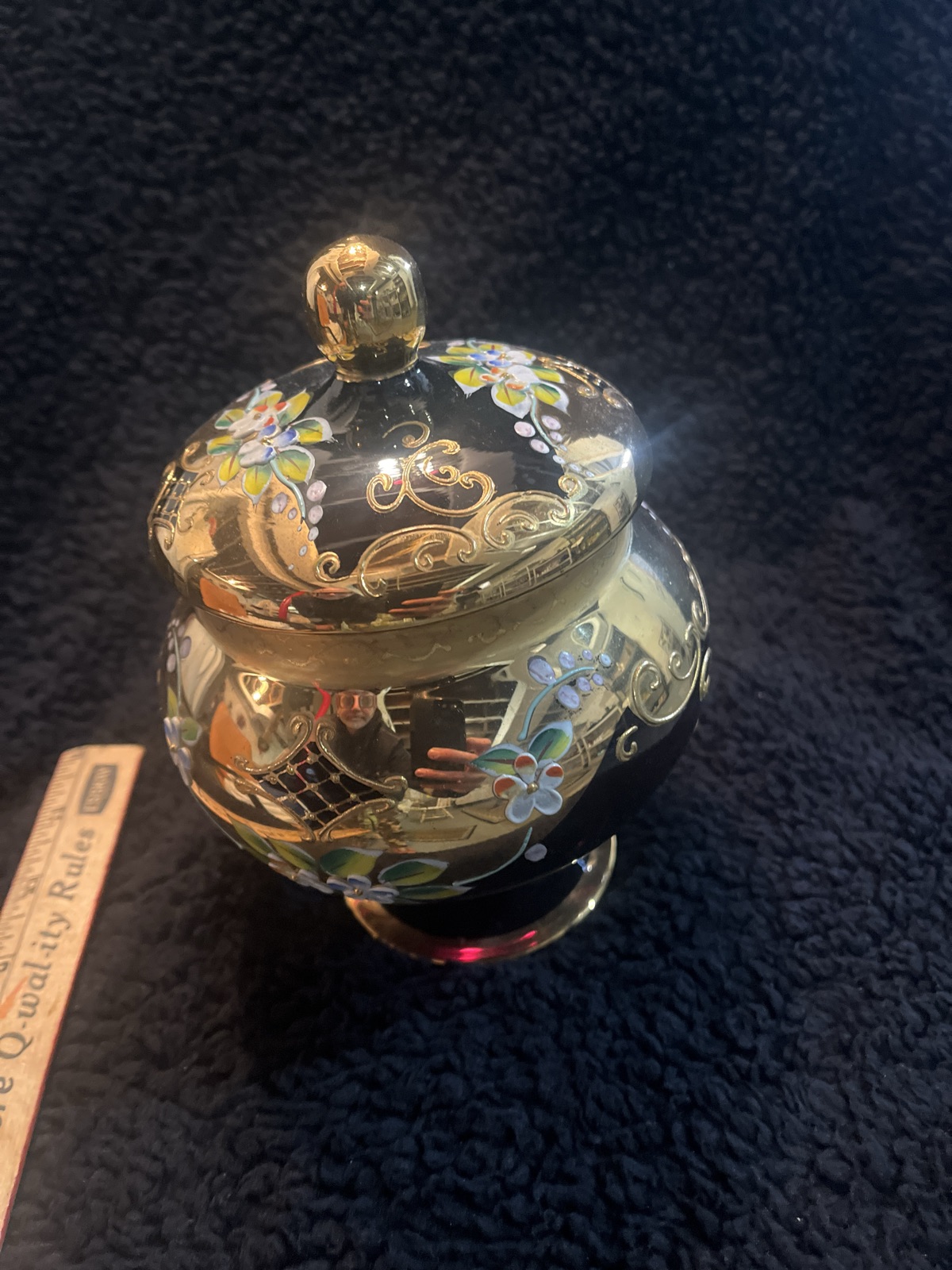 This is a classic example of Venetian 'Tre Fuochi' (Three Fires) glassware, featuring a deep cobalt blue body adorned with heavy 24K gold leaf and hand-painted enamel flowers.