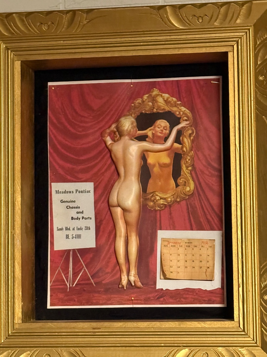 A rare vacuum-formed plastic 3D advertising calendar featuring a bas-relief nude pin-up in a classic 'mirror' pose.