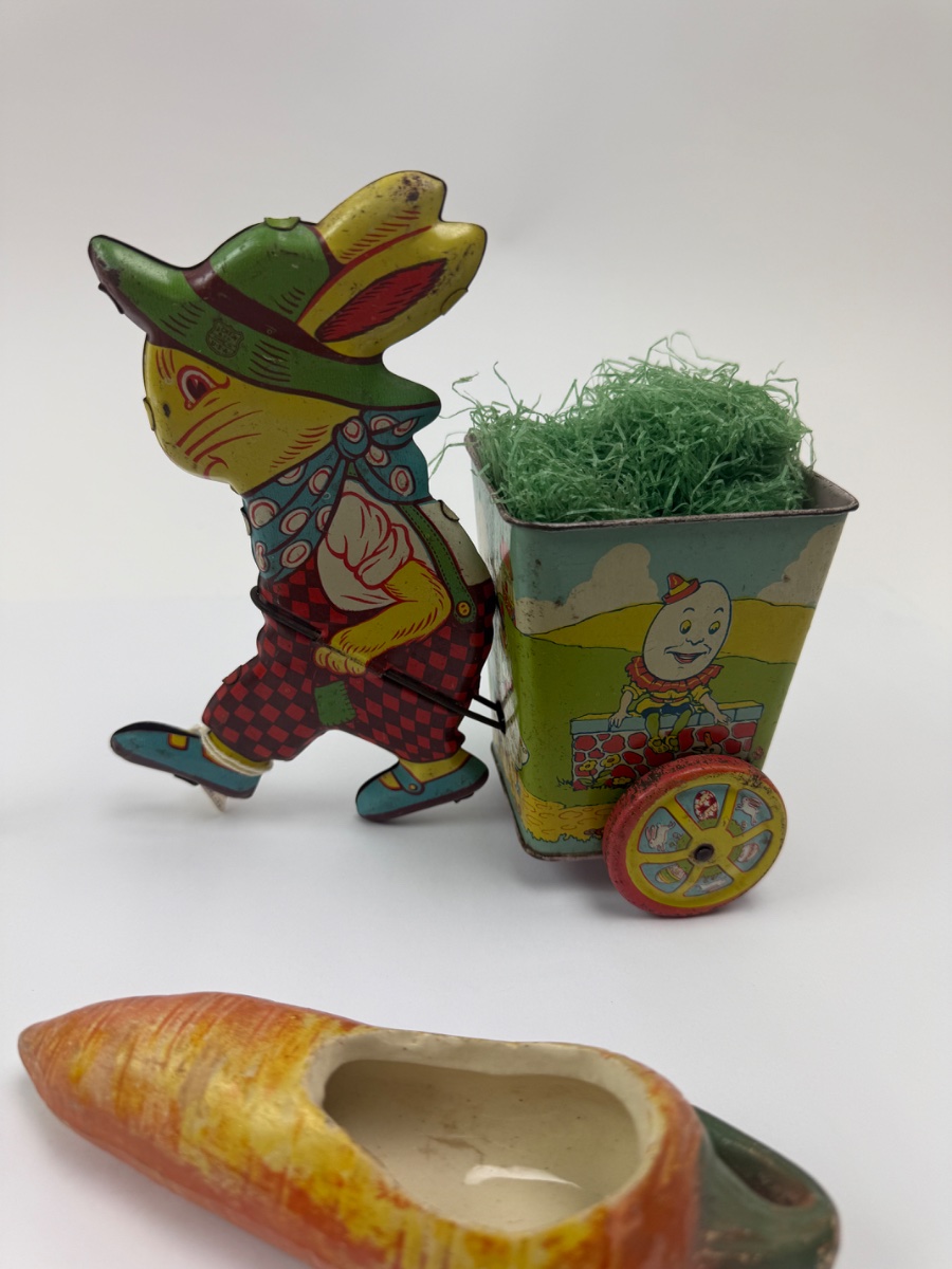 A classic example of American lithographed tinware, this toy features a whimsical bunny in checkered overalls pushing a cart decorated with nursery rhyme motifs.