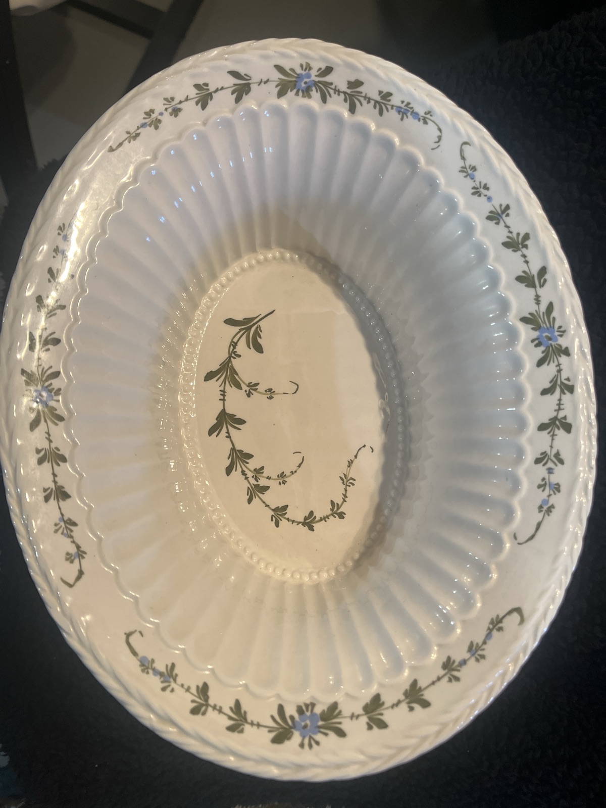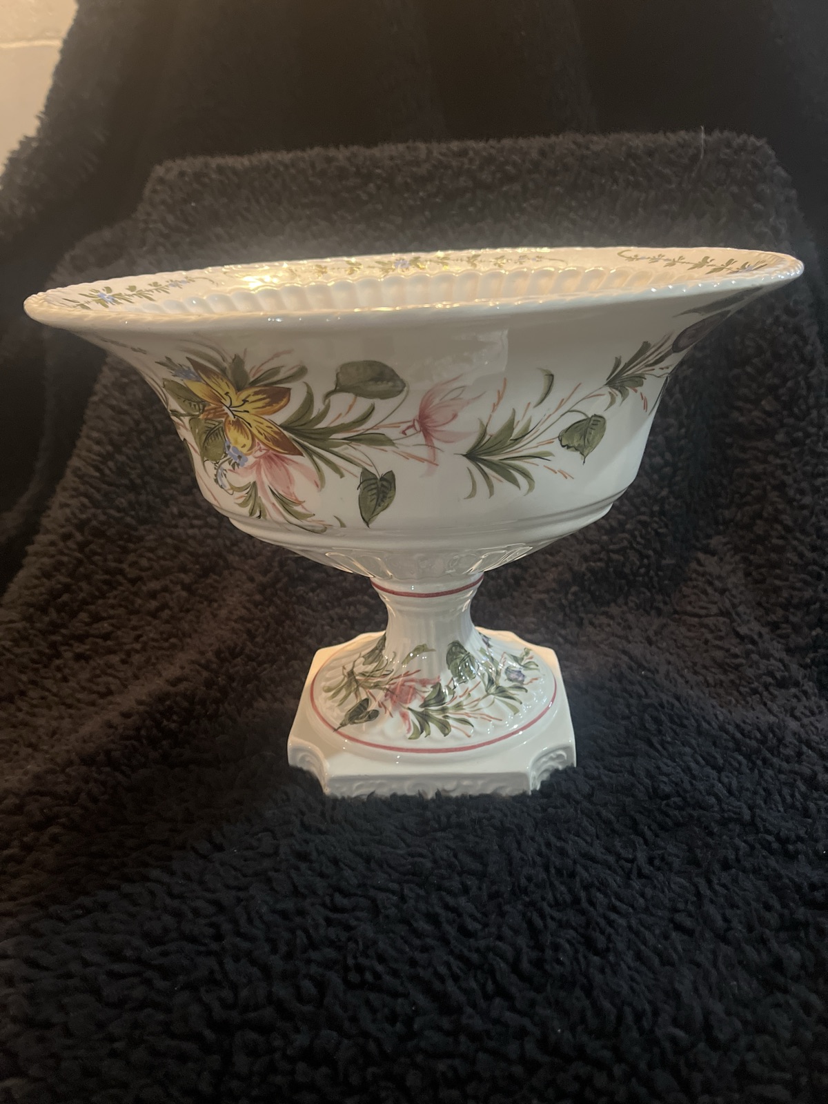 This is a classic Italian earthenware compote featuring a fluted oval bowl set upon a pedestal base with a notched square foot.