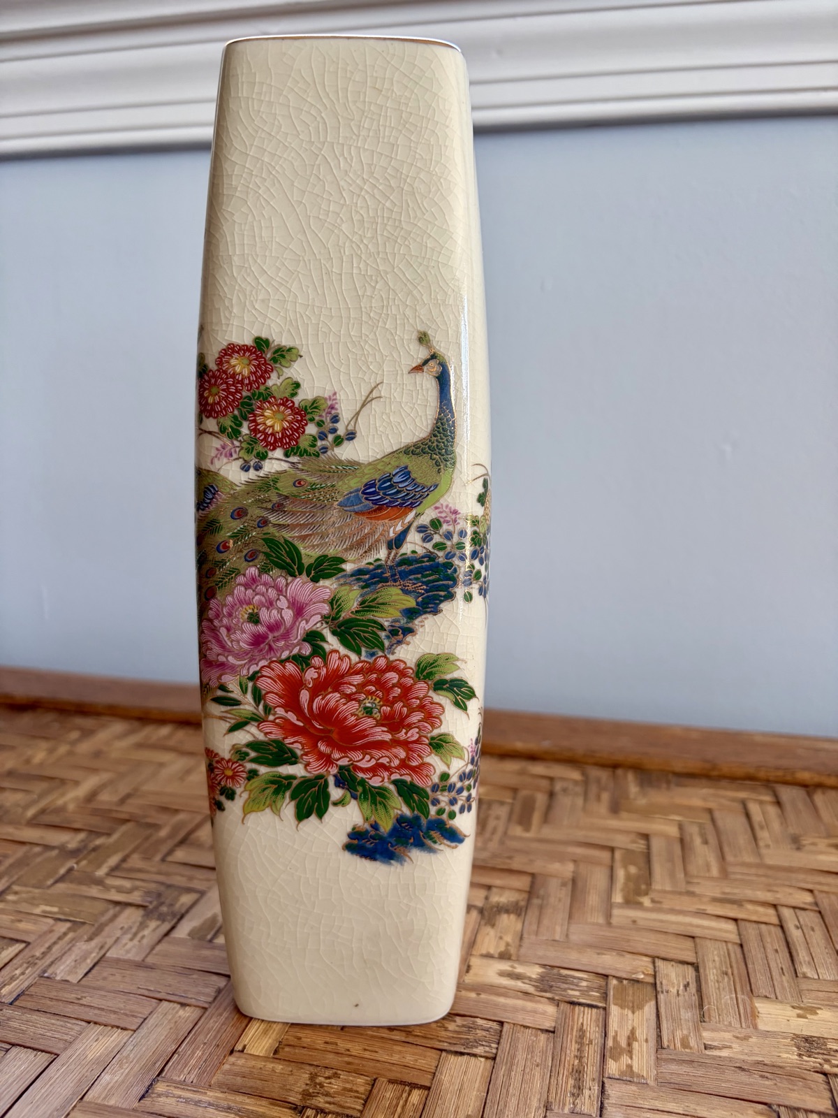 The vase appears to be in excellent vintage condition with the intentional crackle glaze remaining clean and free of 'tea staining' (discoloration inside the cracks). Value for mid-century Satsuma-style export ware is driven primarily by the popularity of the motif (peacocks are highly collectible) and the preservation of the gold…