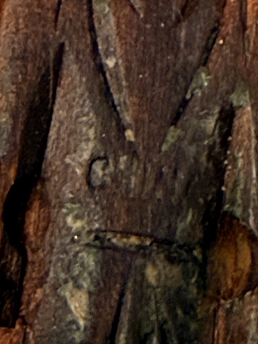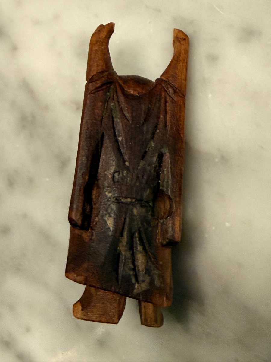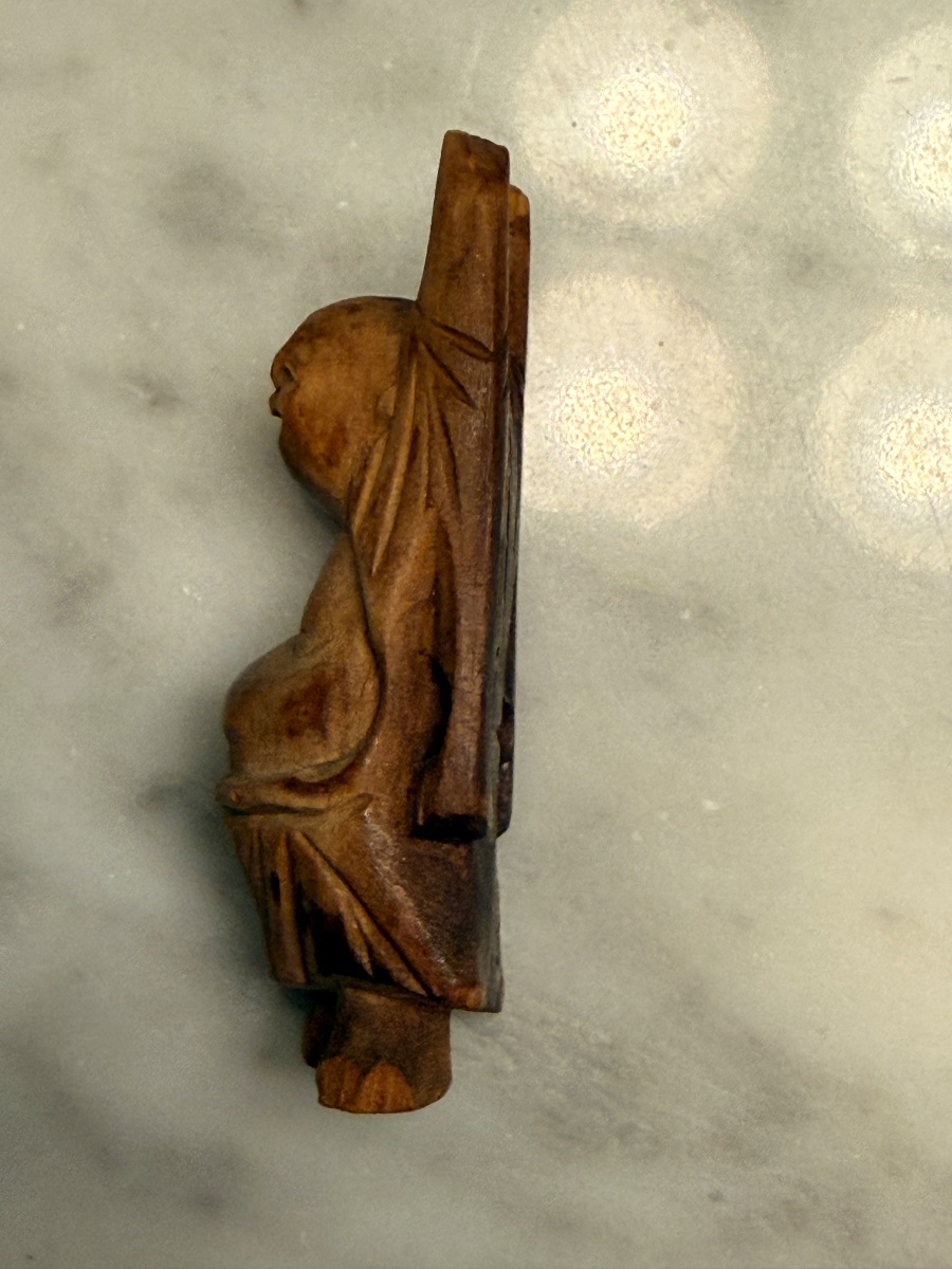The piece shows honest age-related wear, with some darkening of the wood and minor softening of the carved edges. Value is driven by its hand-carved nature and vintage appeal.